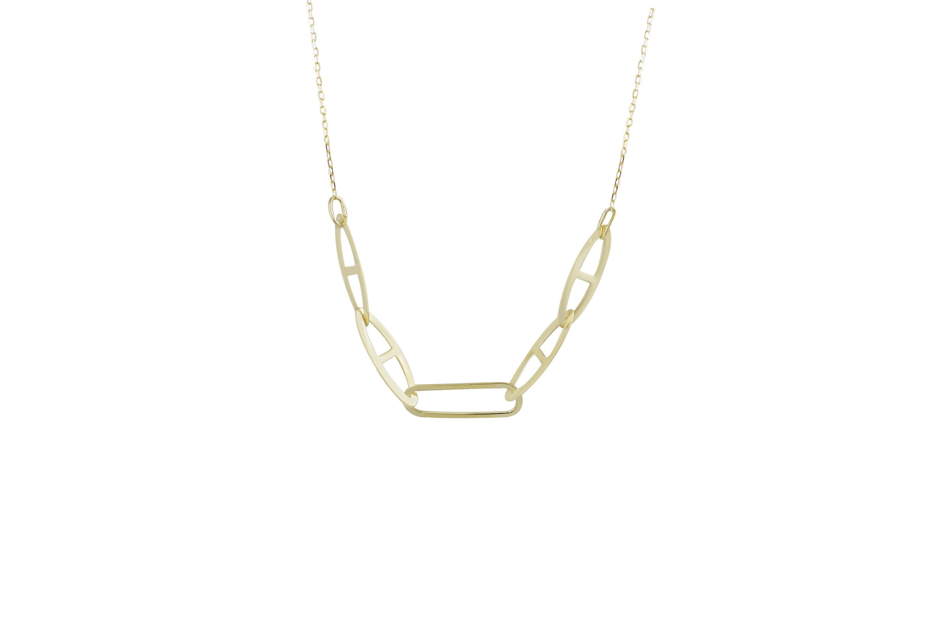 Deze elegante paperclip ketting in goud is de perfecte toevoeging aan elke outfit. Met 4 ovale schakels en 1 rechthoekige schakel, biedt deze ketting een unieke en stijlvolle look. Het is zeker een blikvanger en zal zeker opvallen.