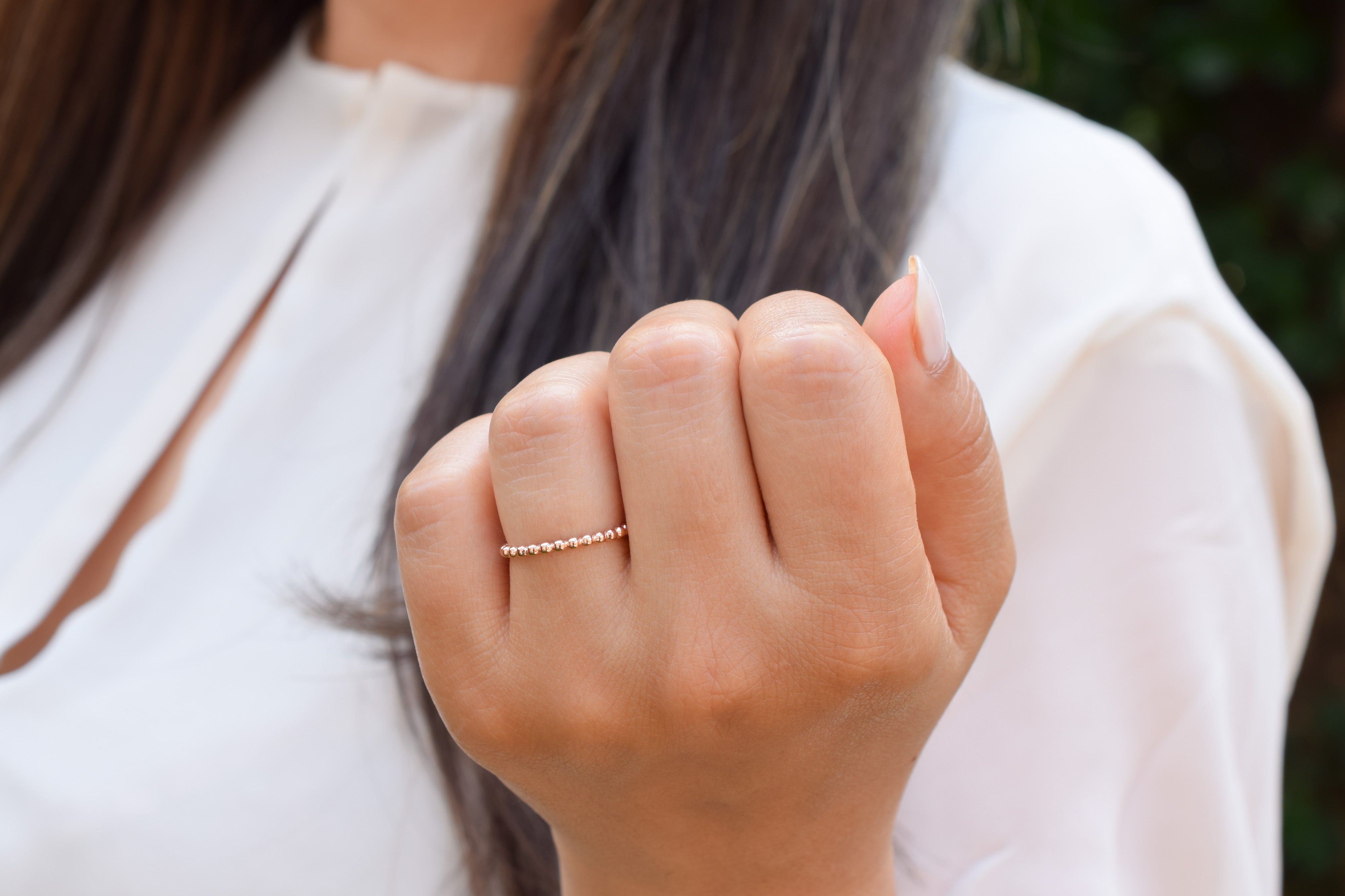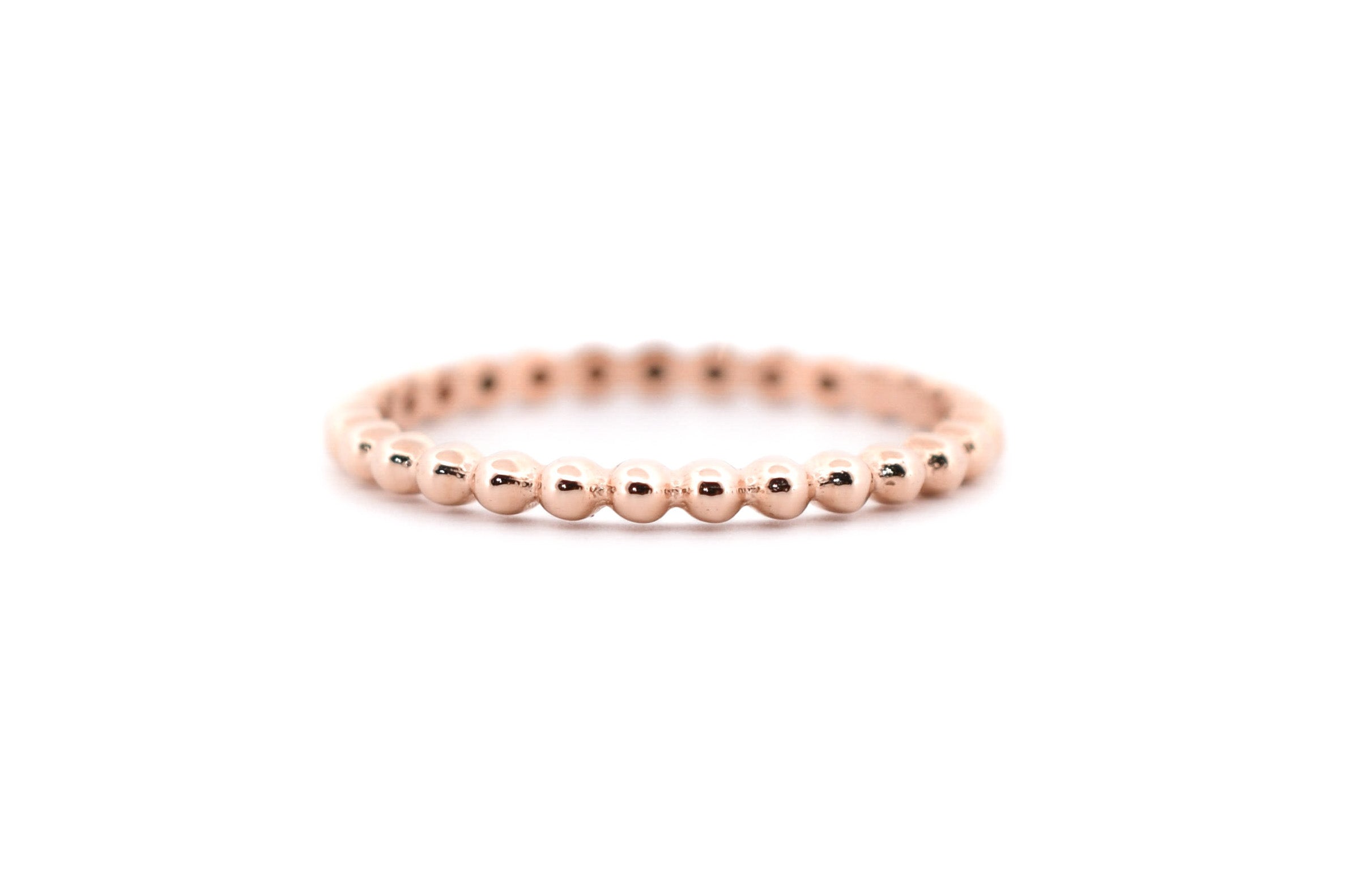 De ring bestaat uit fijn gepolijste bolletjes die aan elkaar verbonden zijn.