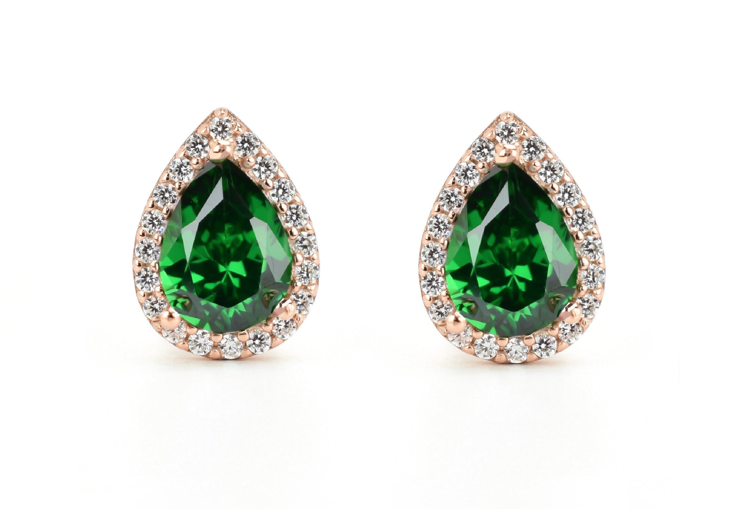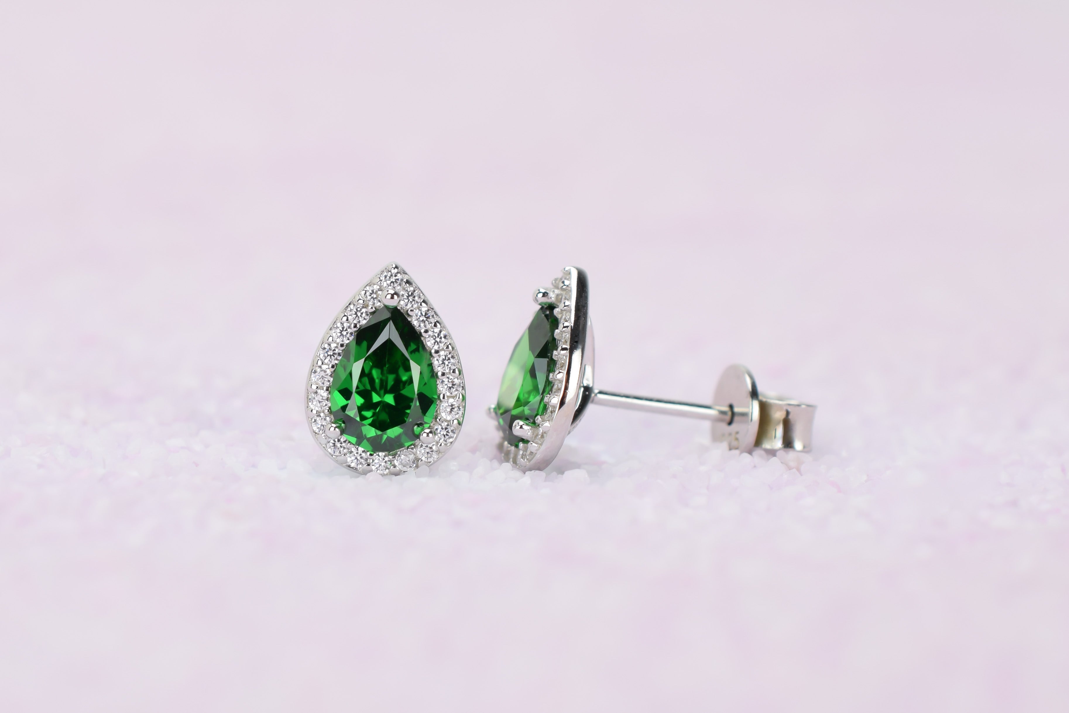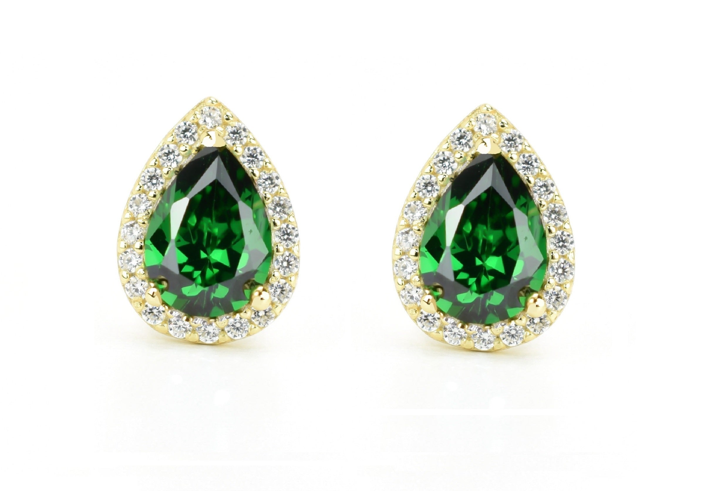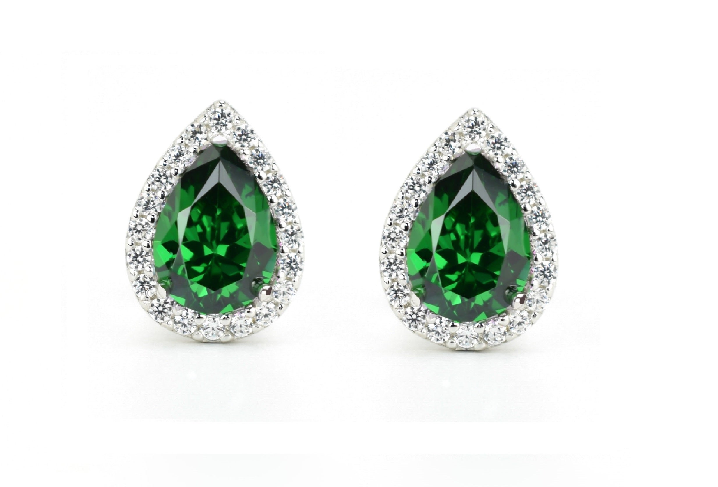 Deze sprankelende halo oorsieraden in de vorm van een druppel zijn bezet met adembenemende donker groene smaragd stenen, die omlijst worden met heldere geaccentueerde kleine stenen. Een persoonlijk cadeau voor iemand die in mei is geboren en een schitterend oorsieraad om elke dag te dragen.