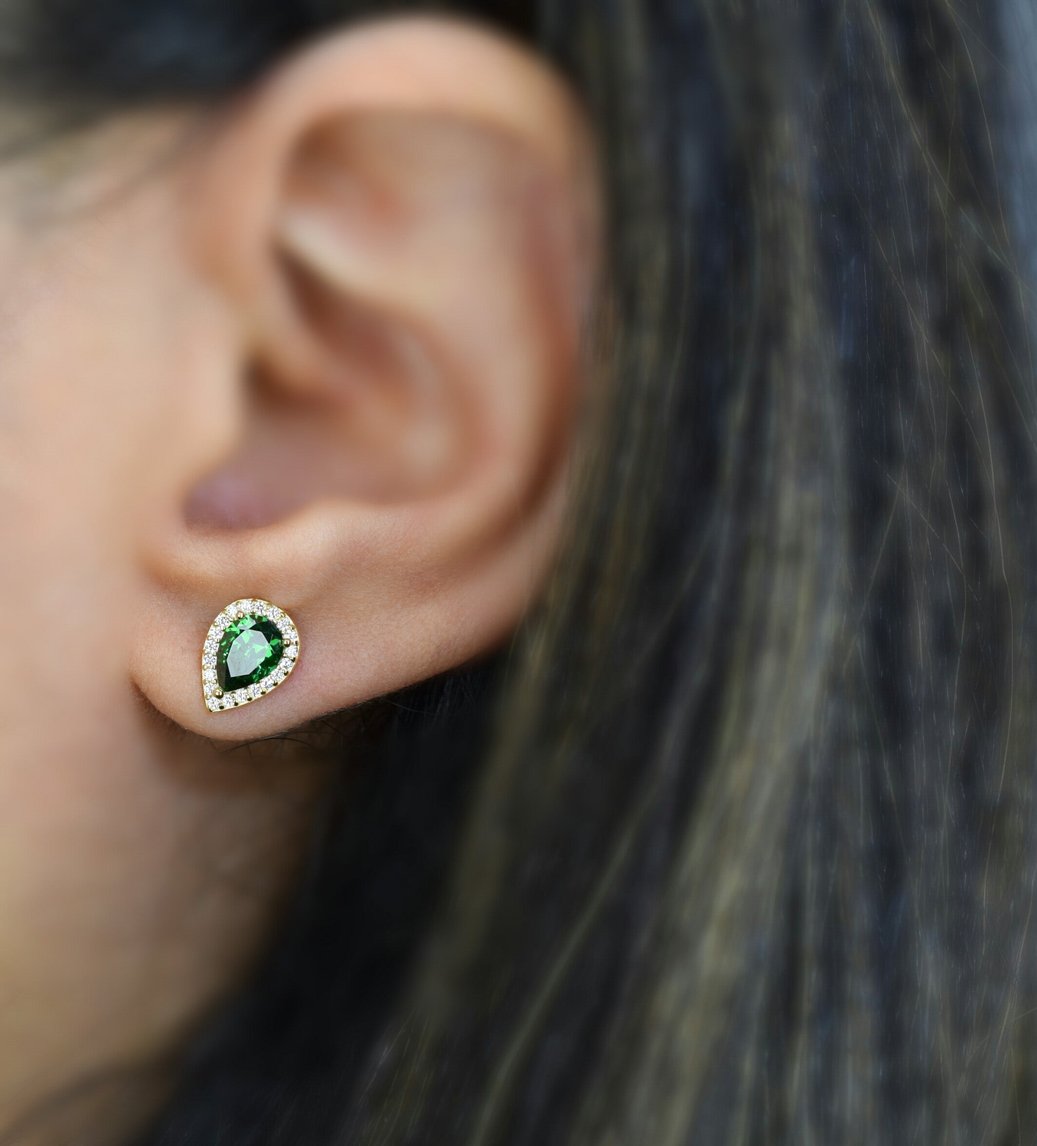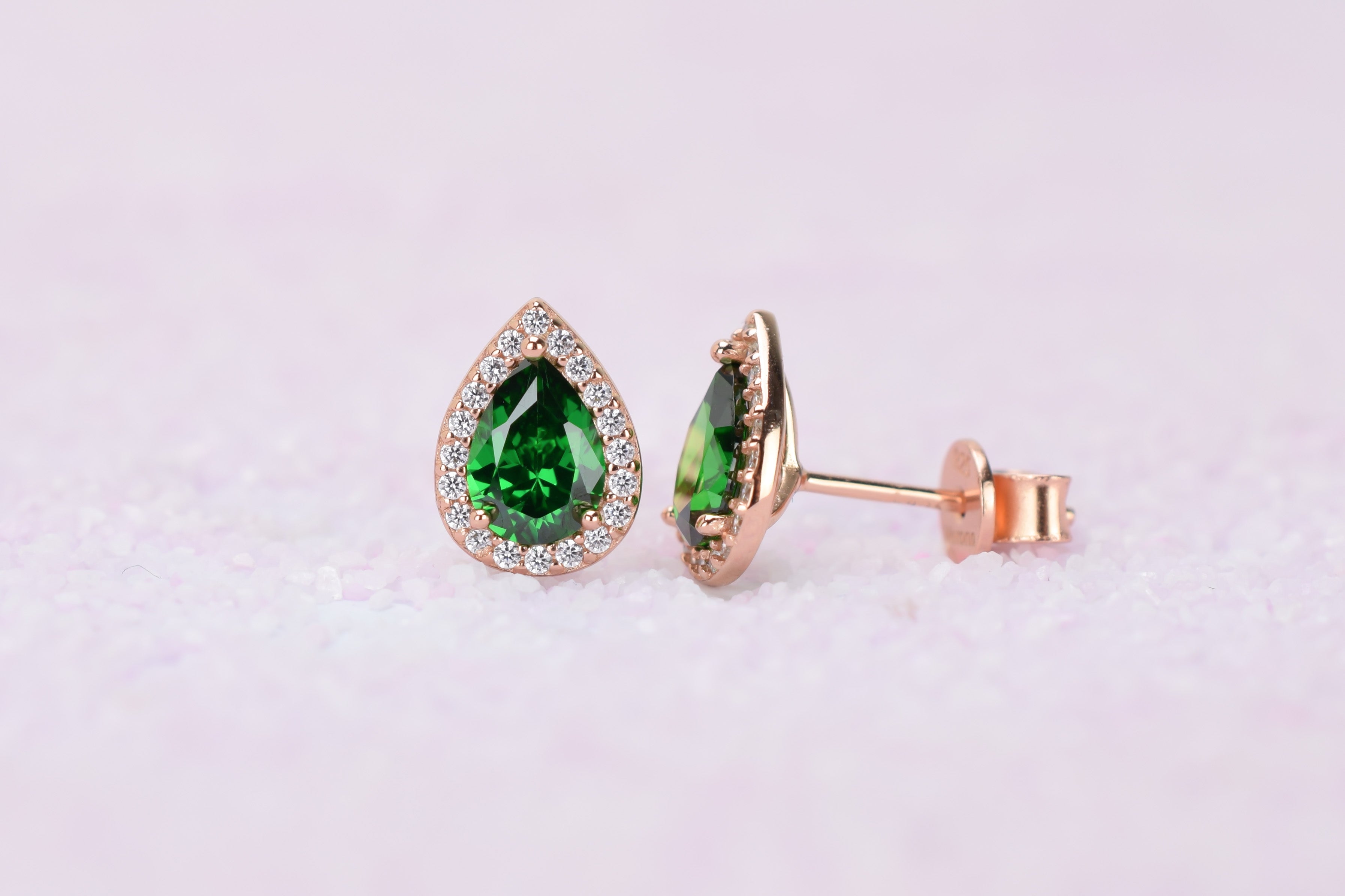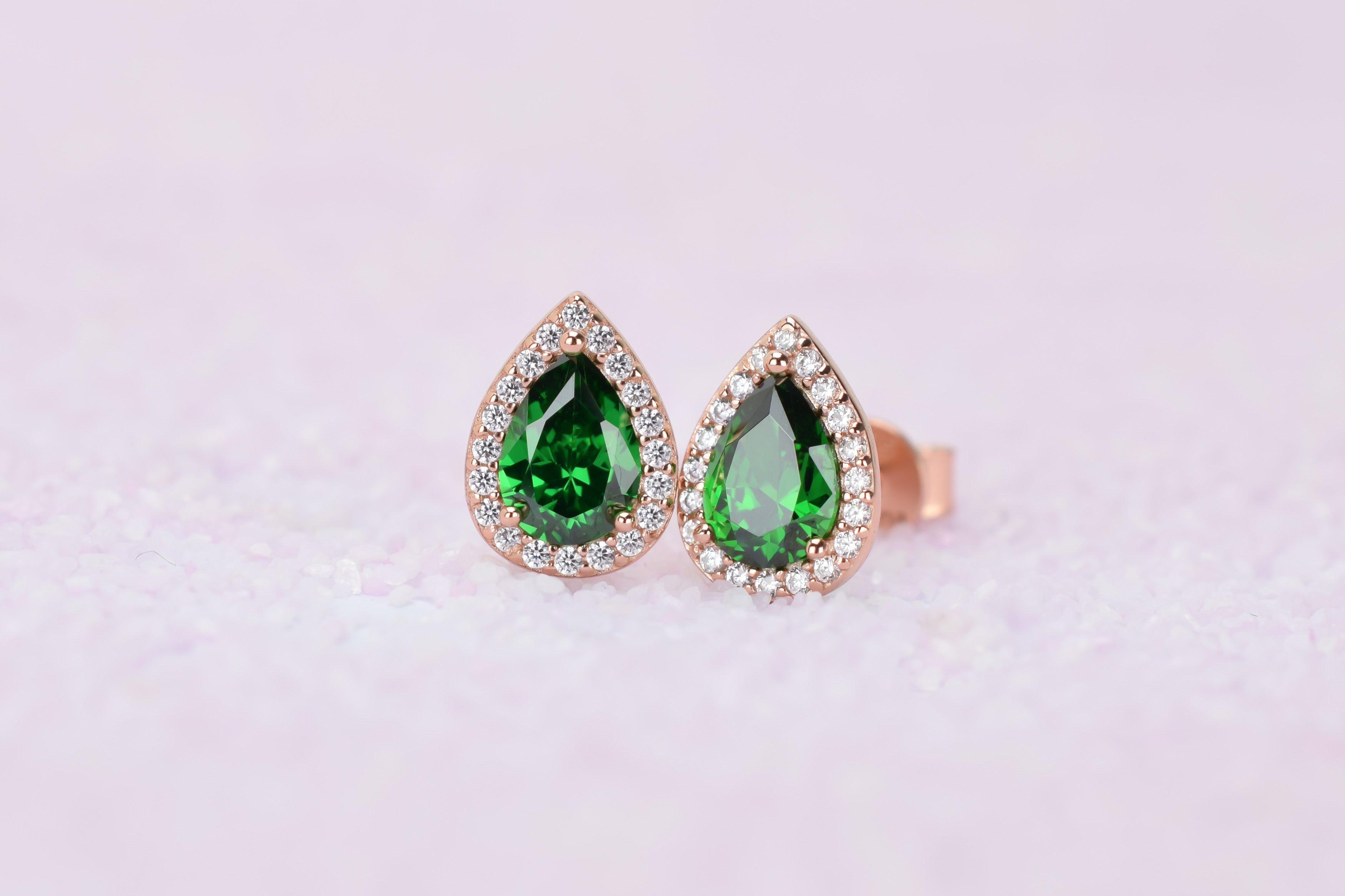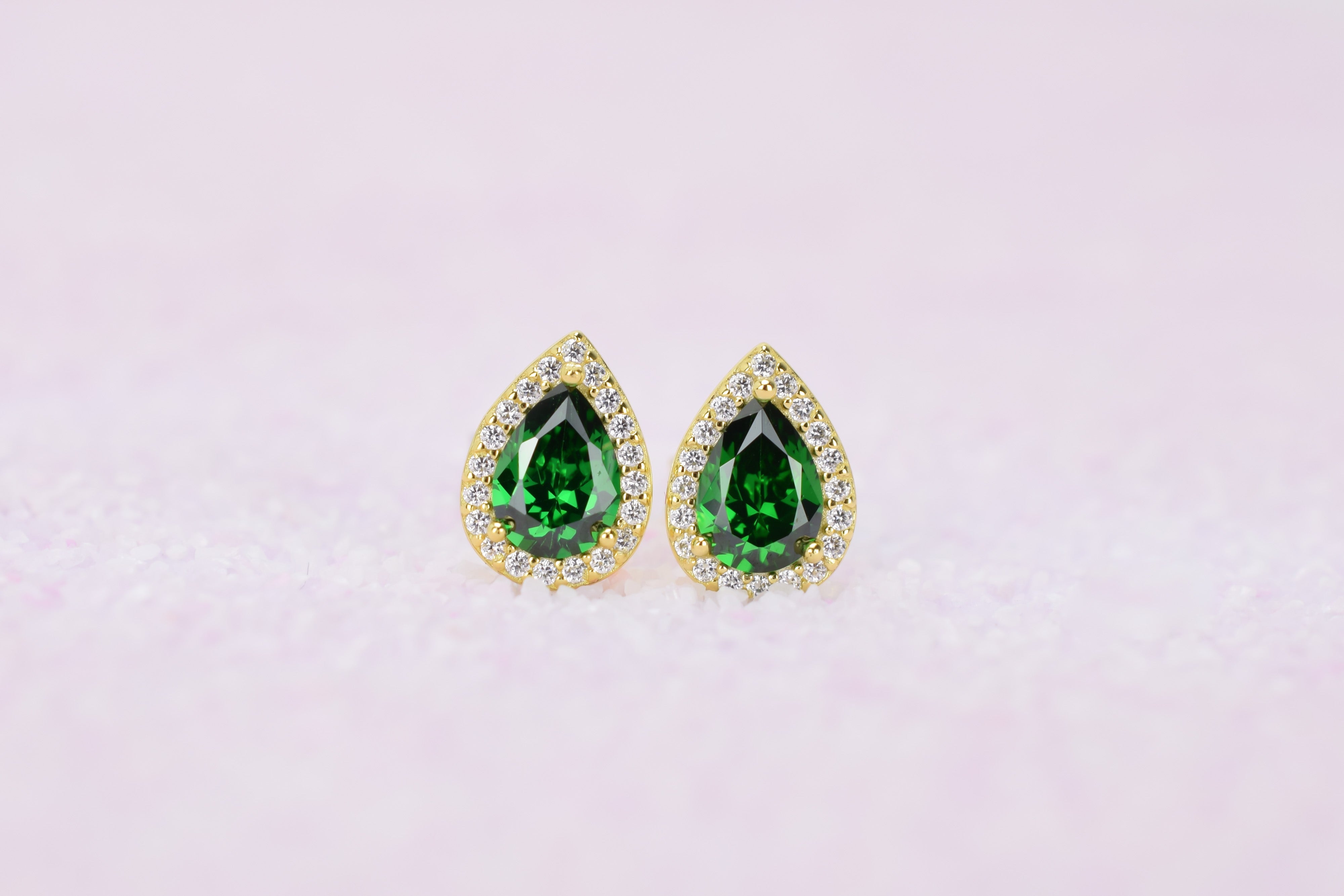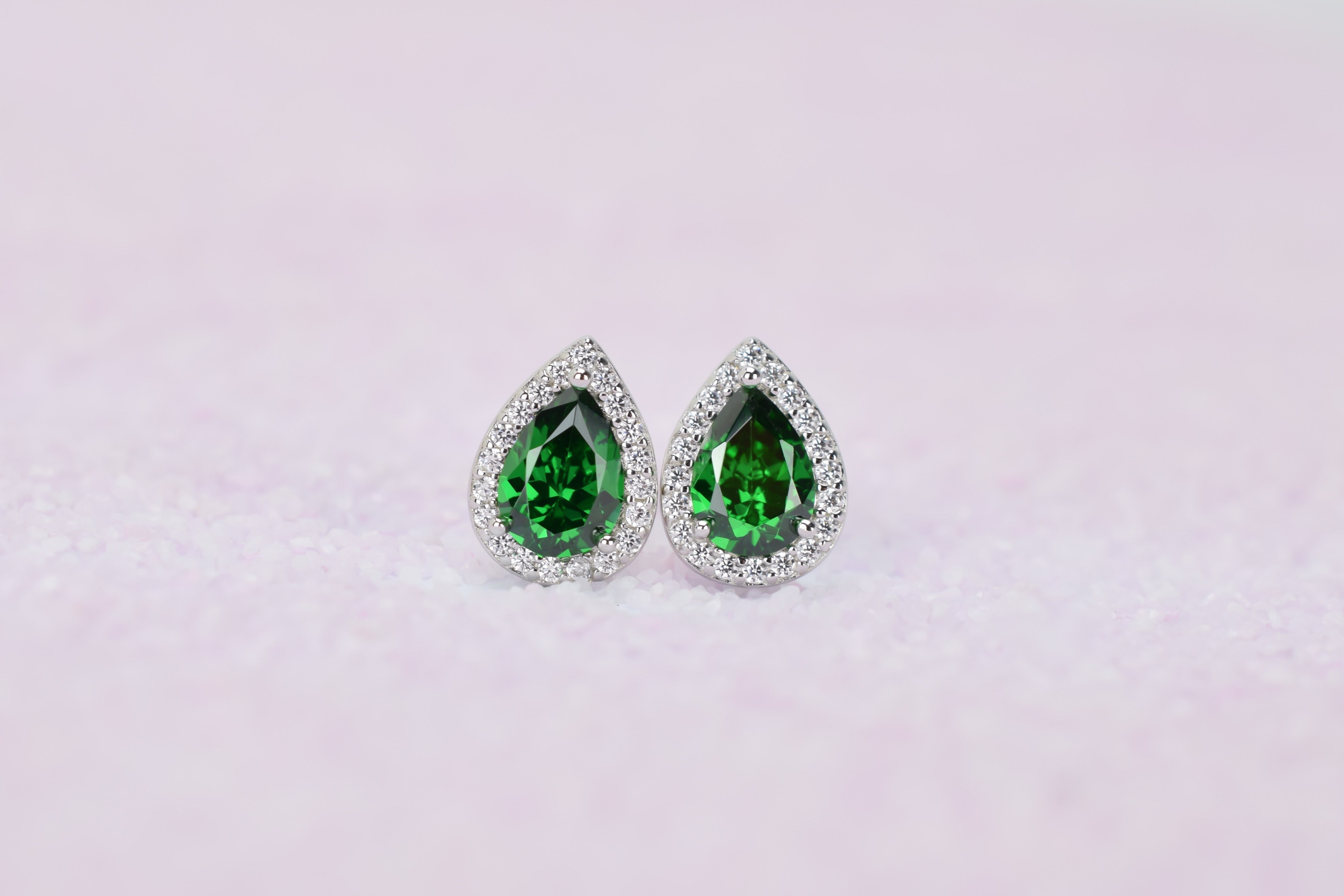 Deze sprankelende halo oorsieraden in de vorm van een druppel zijn bezet met adembenemende donker groene smaragd stenen, die omlijst worden met heldere geaccentueerde kleine stenen. Een persoonlijk cadeau voor iemand die in mei is geboren en een schitterend oorsieraad om elke dag te dragen.