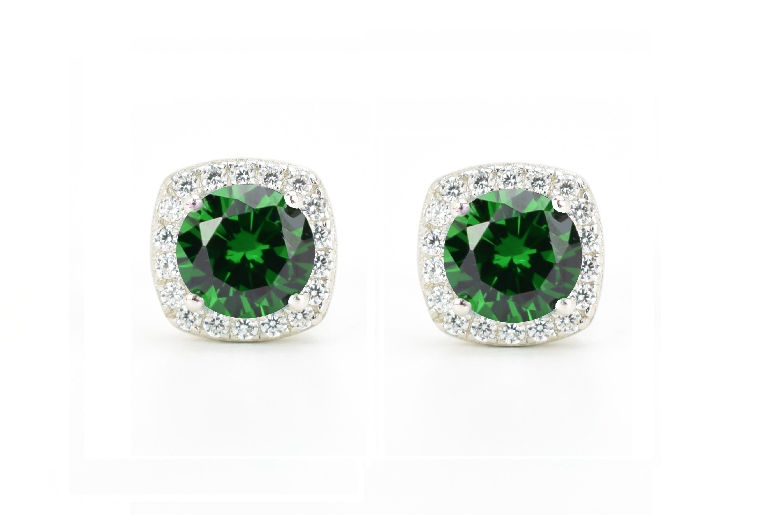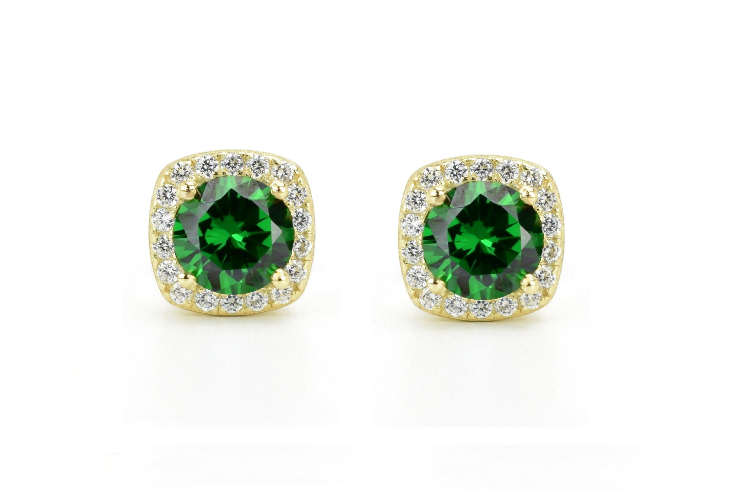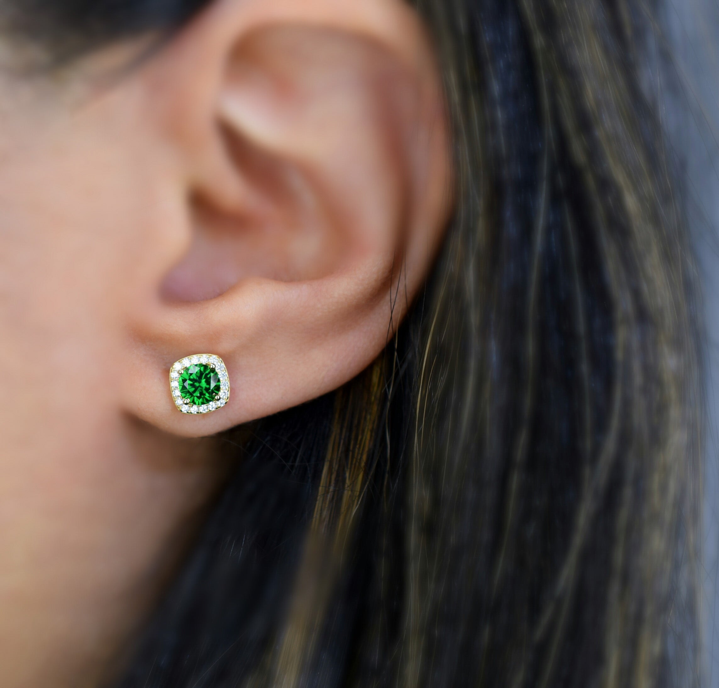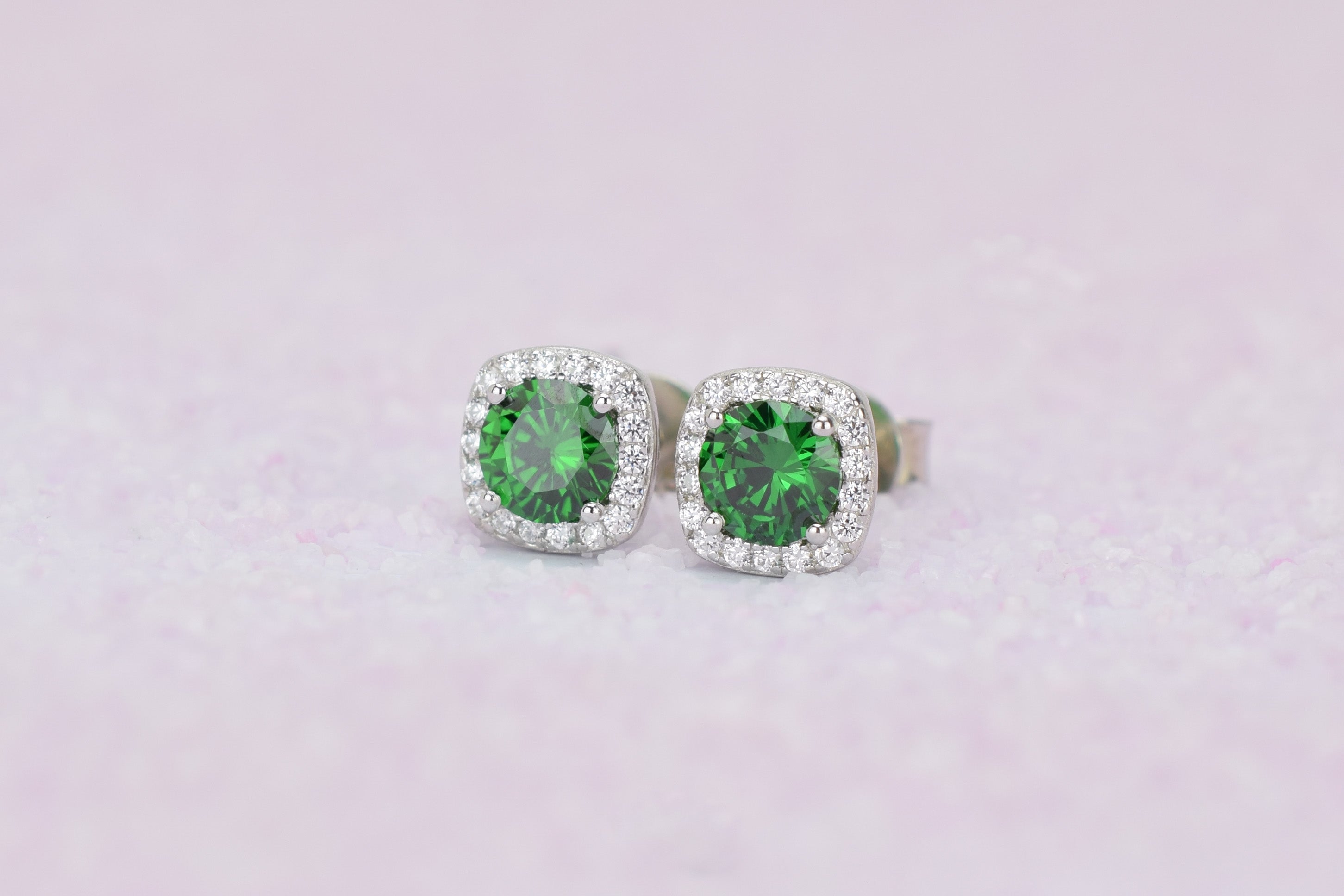 Deze sprankelende halo oorsieraden zijn bezet met adembenemende donker groene smaragd stenen, die omlijst worden met heldere geaccentueerde kleine stenen. Een persoonlijk cadeau voor iemand die in mei is geboren en een schitterend oorsieraad om elke dag te dragen.