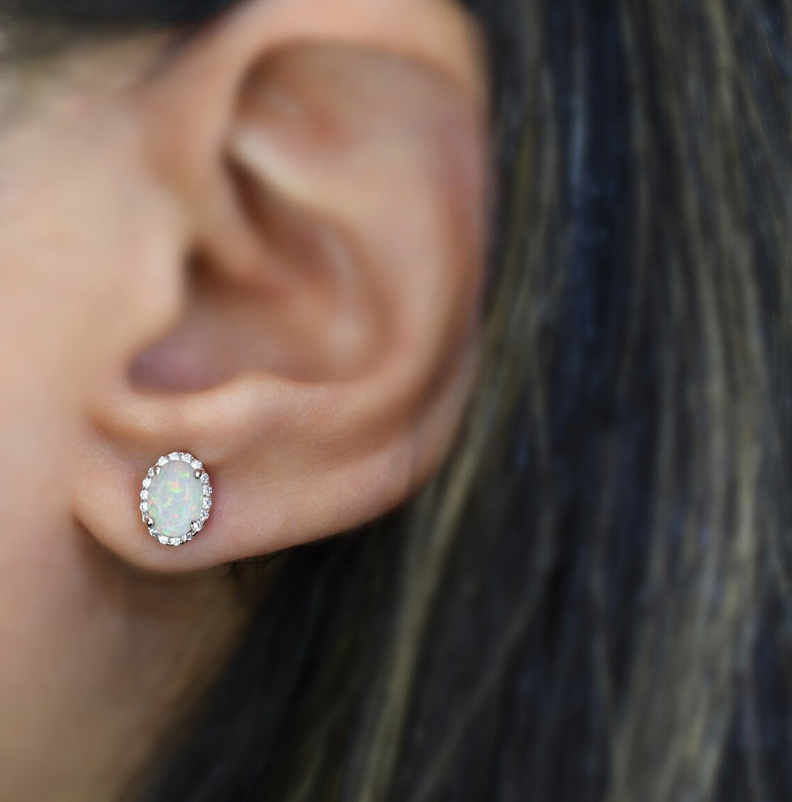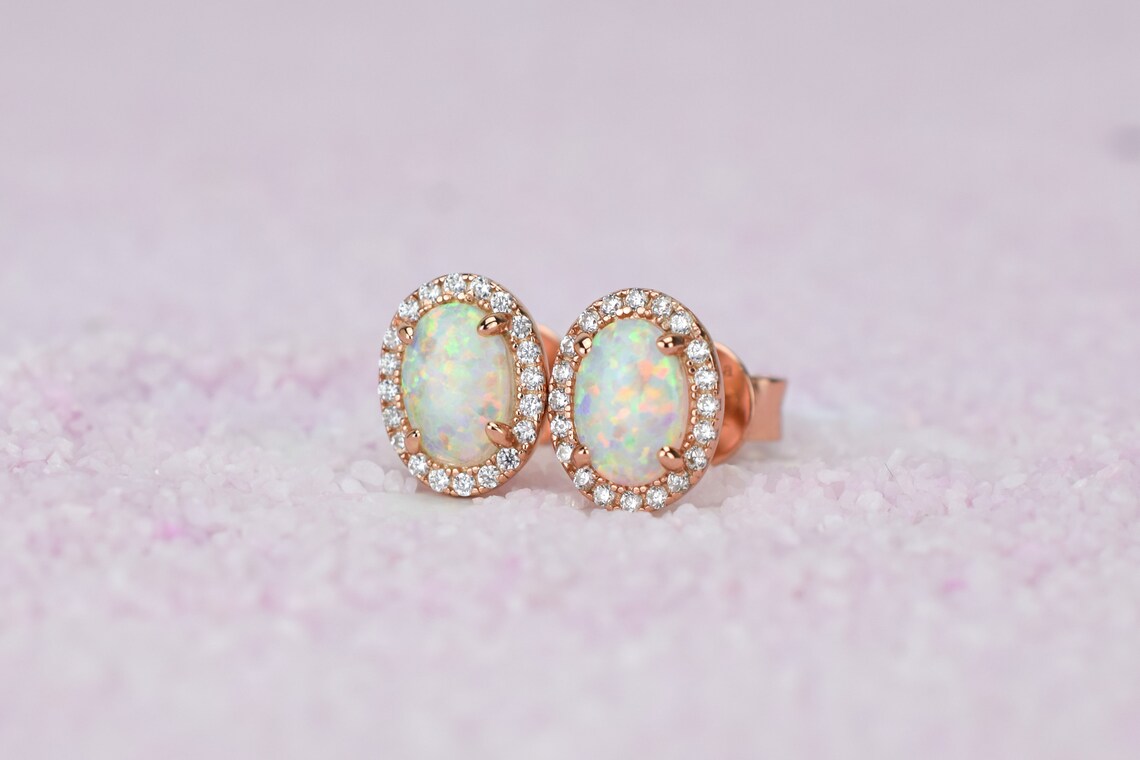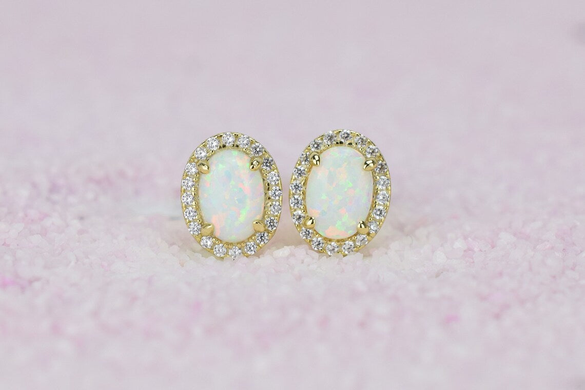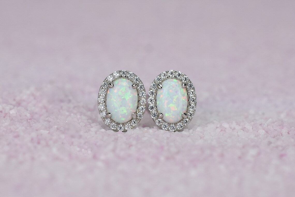 Deze sprankelende halo oorsieraden zijn bezet met adembenemende witte opaal stenen, die omlijst worden met heldere geaccentueerde kleine stenen. Een persoonlijk cadeau voor iemand die in oktober is geboren en een schitterend oorsieraad om elke dag te dragen.