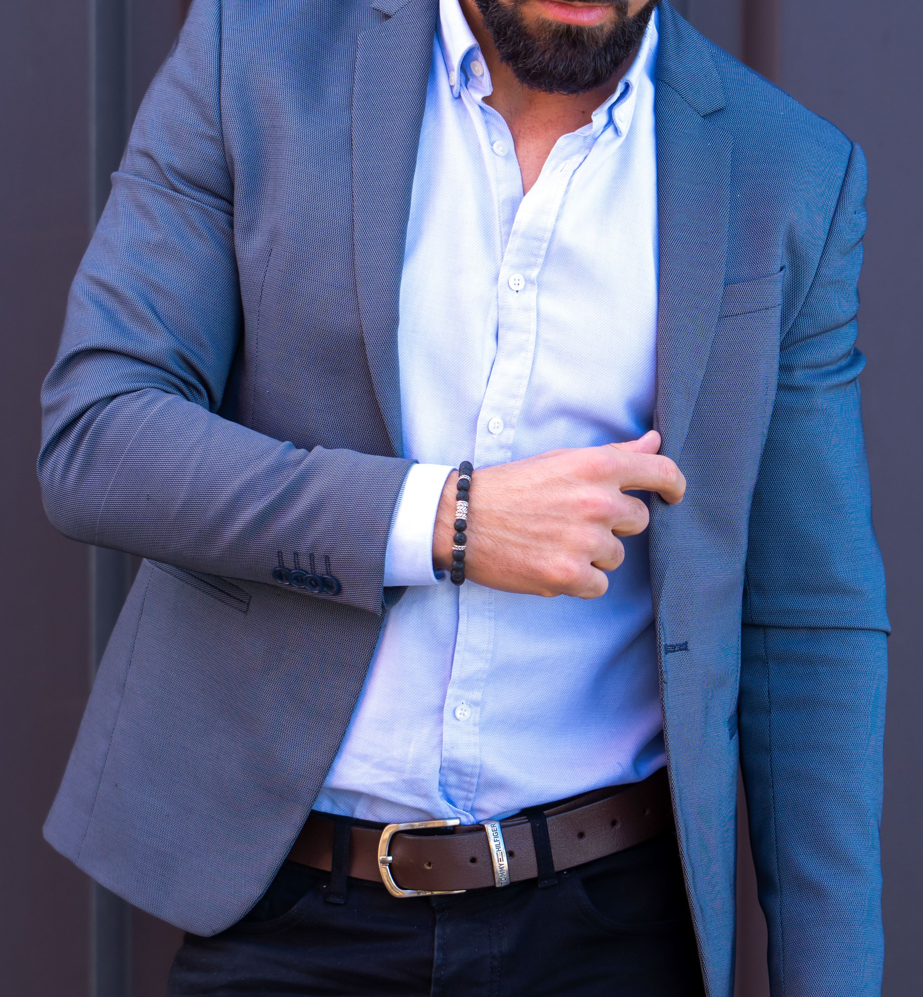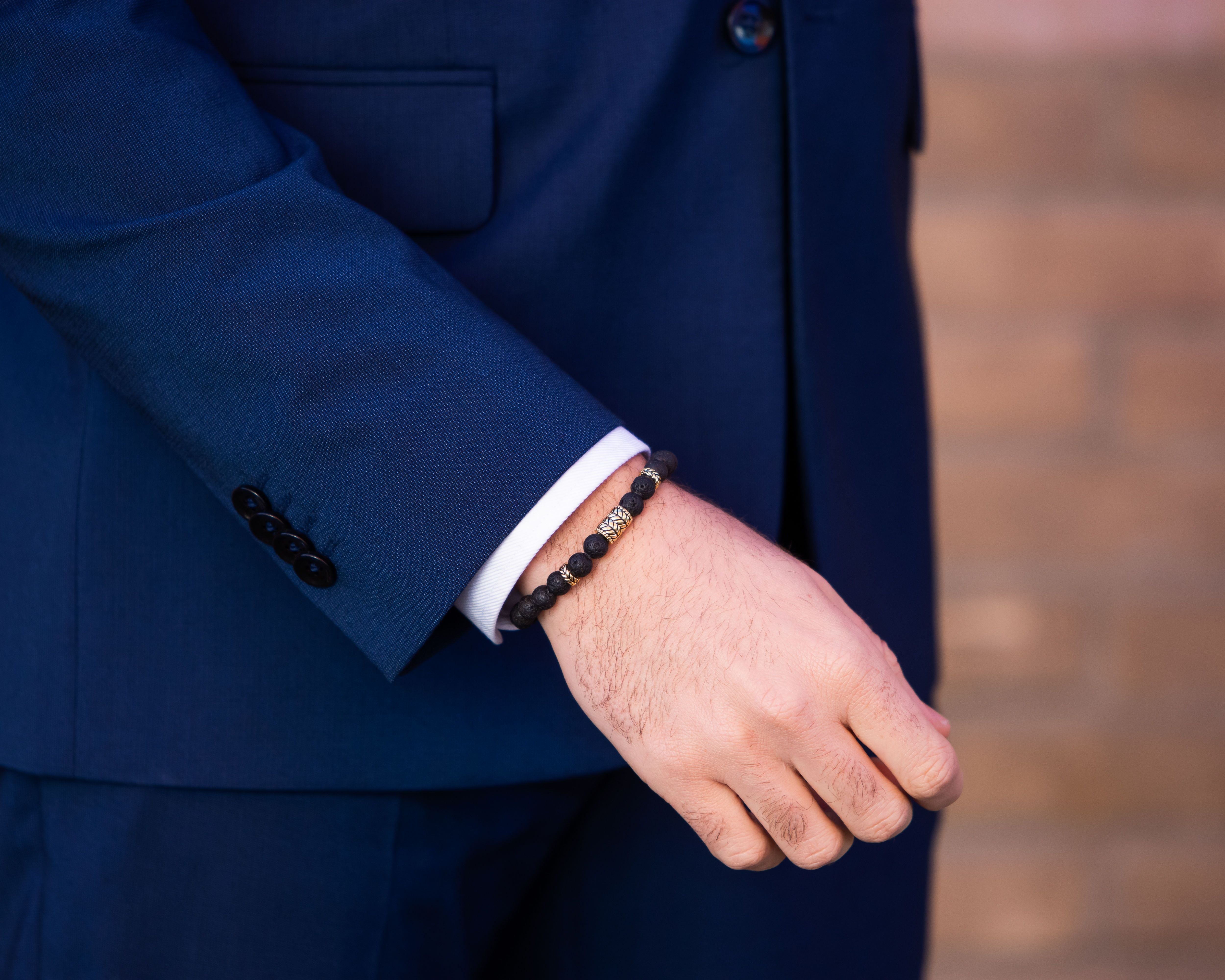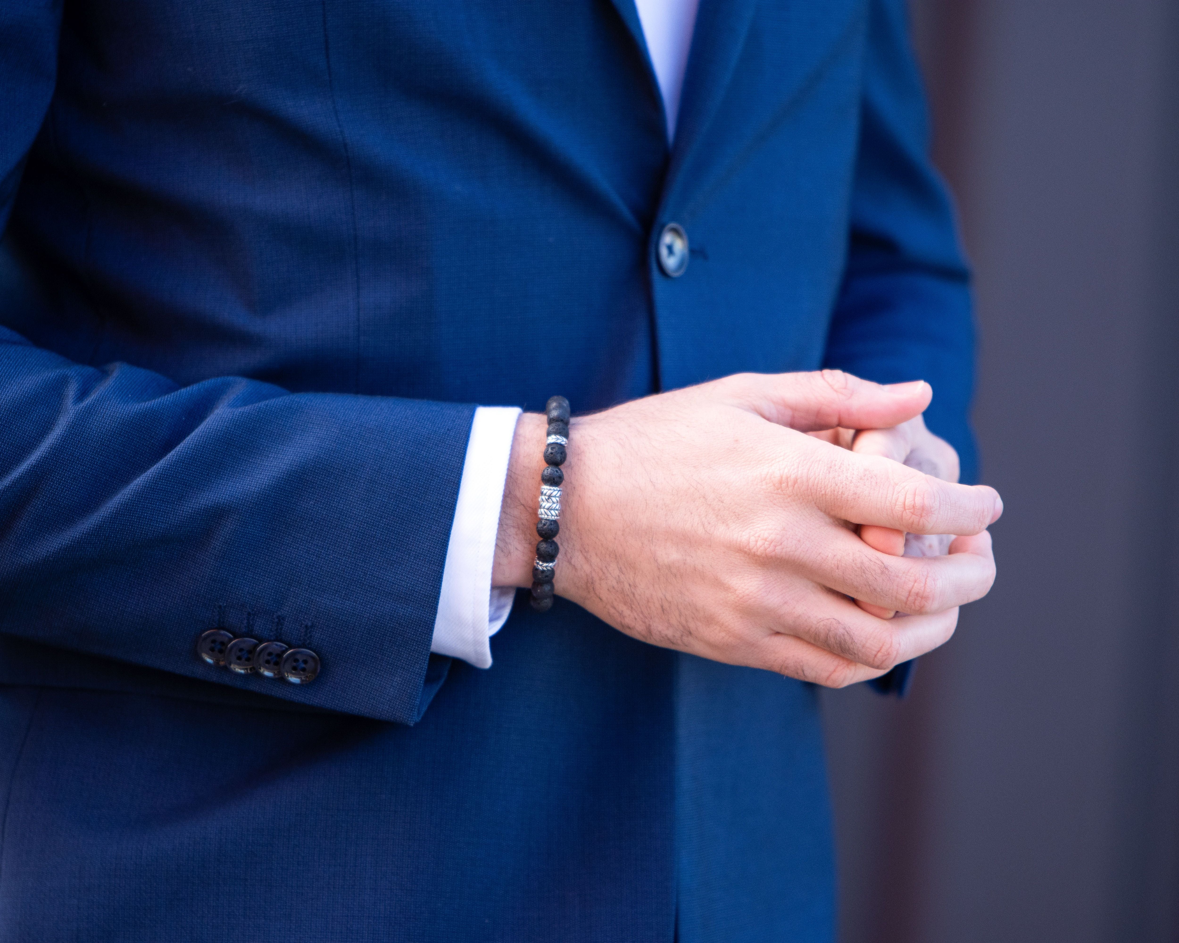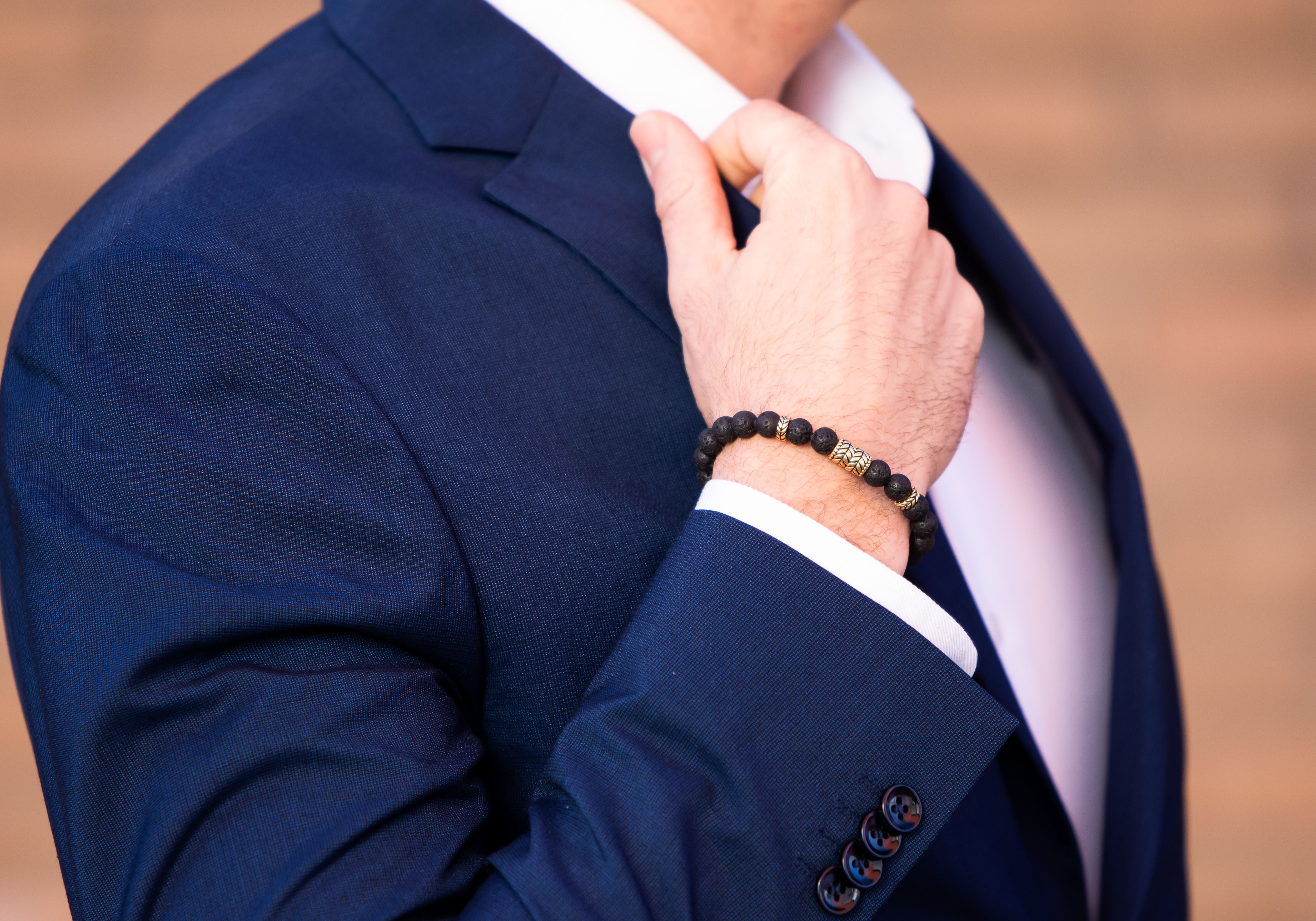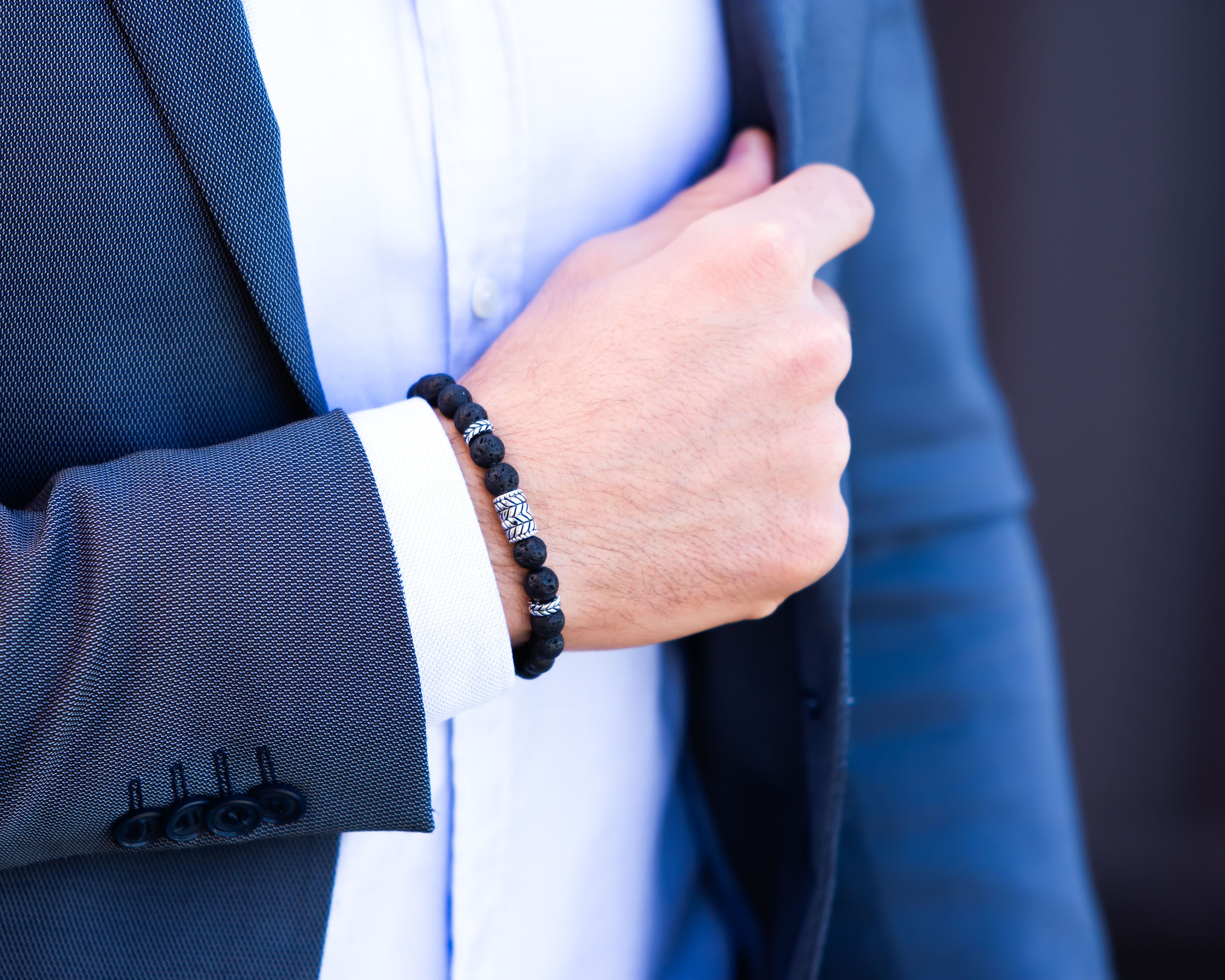 The Black Callisto bead bracelet features mesmerizing natural volcanic stones . The beads have a custom feather pattern that accentuate the natural stones. It has a contrasting mechanical and natural look.