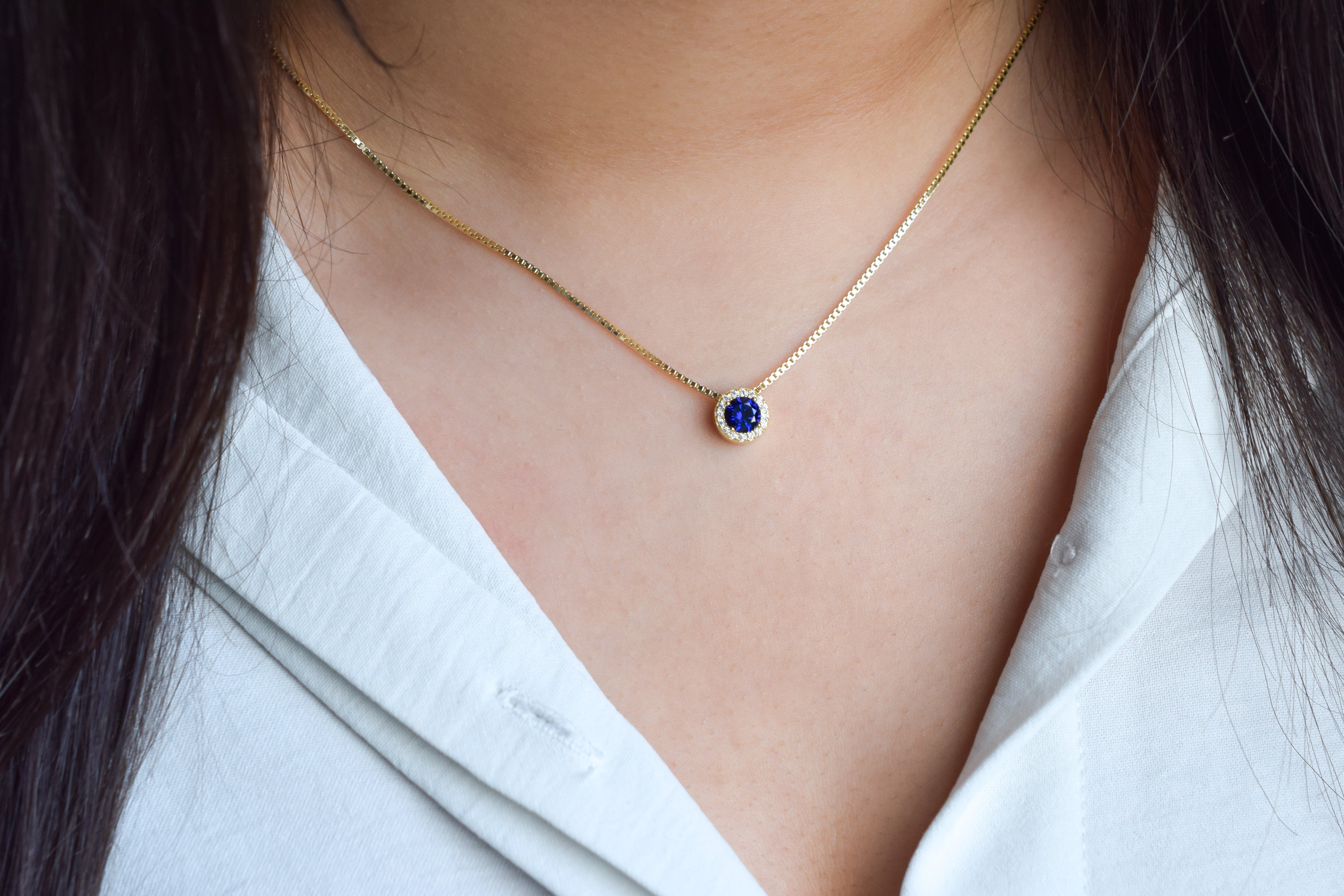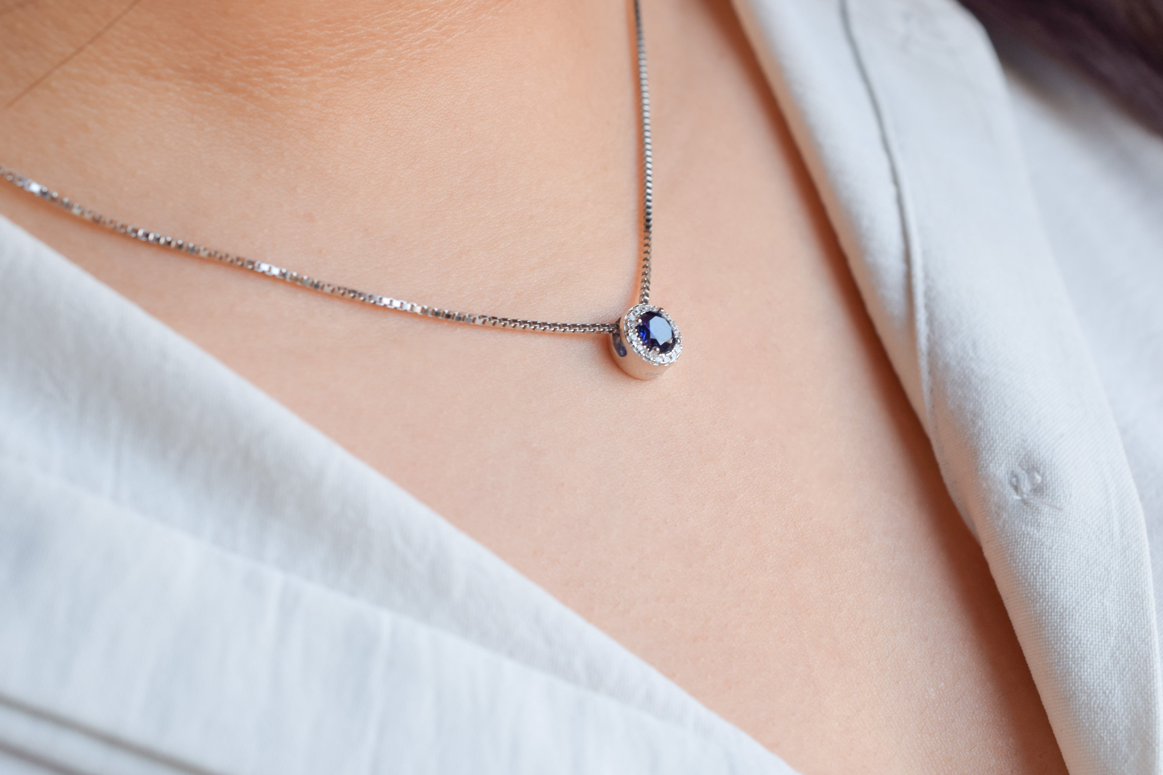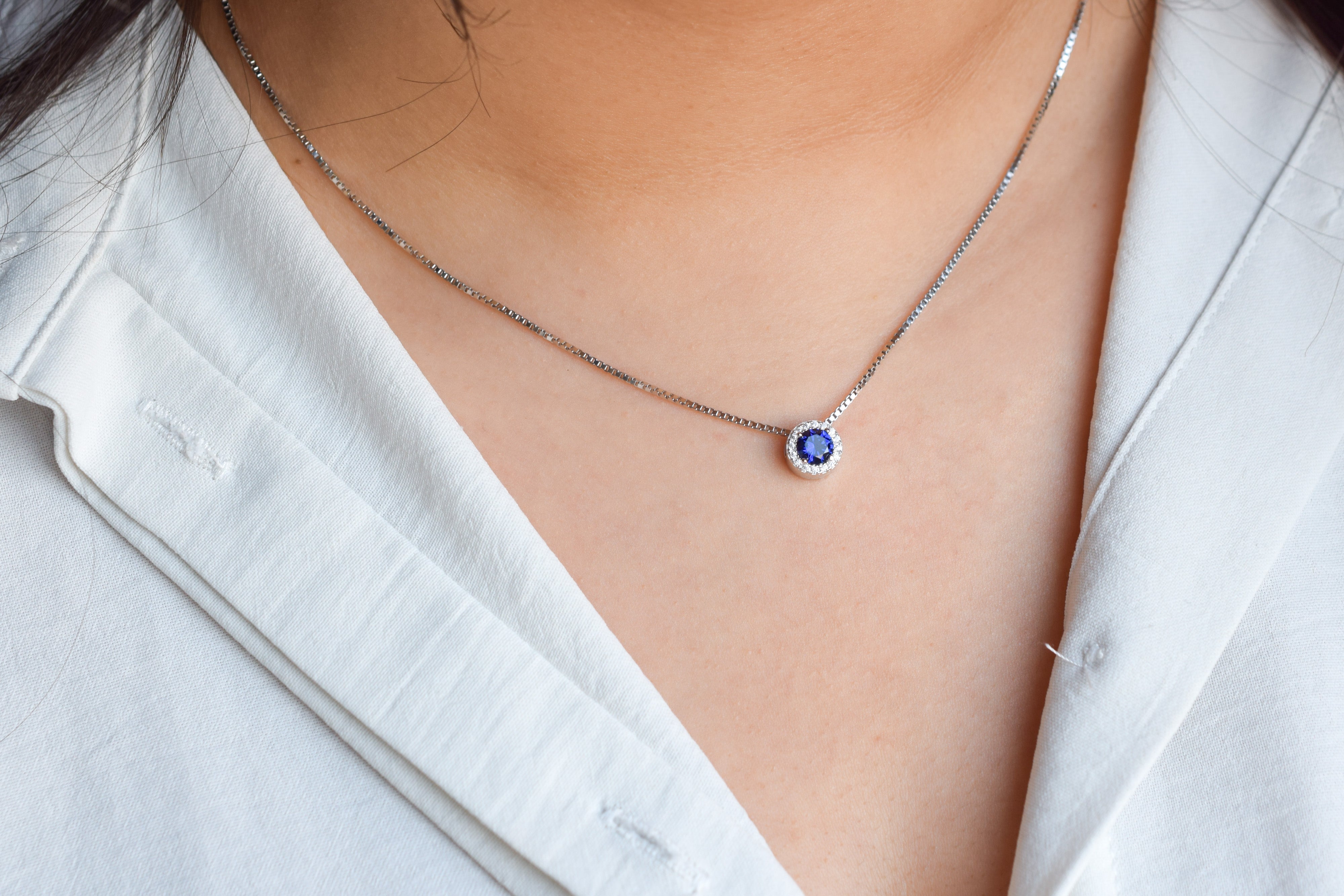 Deze handgemaakte ketting, gesmeed naar een eigen ontwerp, is met kristalheldere precisie en zorg vervaardigd om de hoogste kwaliteit te garanderen. De middelste steen is lab gemaakte Saffier steen, en die zorgvuldig zijn geselecteerd vanwege hun hoge kwaliteit.