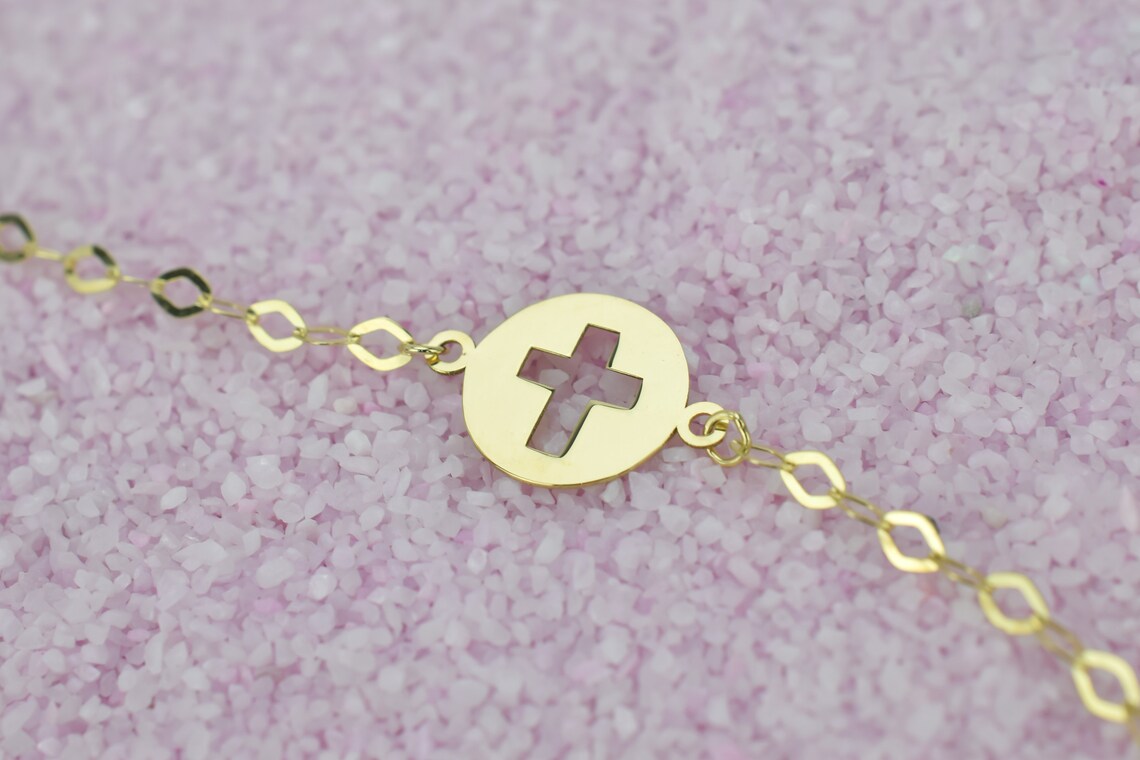 Deze armband is voorzien van een prachtige bedel in de vorm van een kruis en door de speciale schakels van het kettinkje kan de armband aangepast worden aan de maat van de pols. De armband is vervaardigd van geheel 14 karaat goud en gepolijst voor een blijvende glans, en wordt geleverd in een luxe sieraad verpakking.