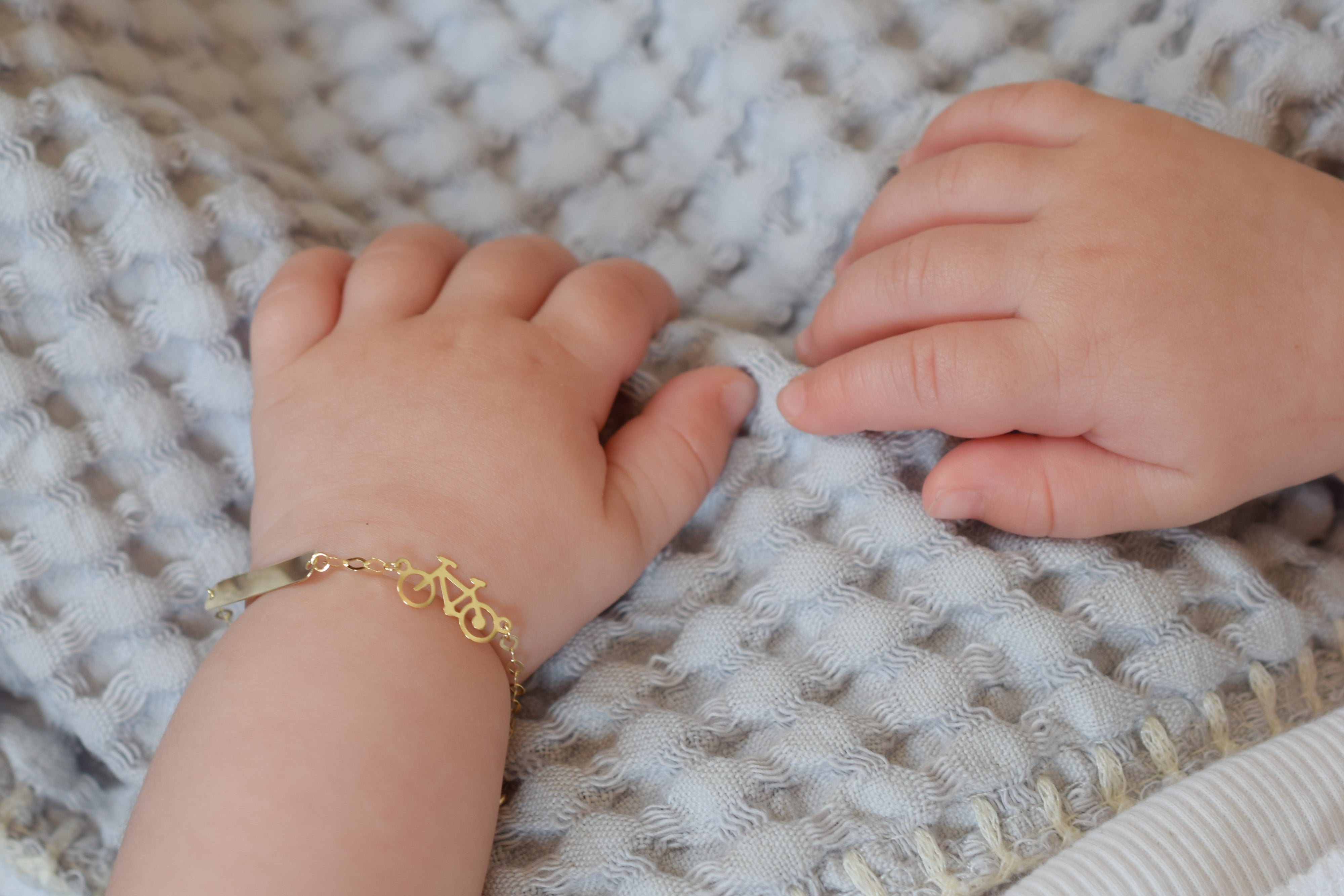 De armband heeft een graveerplaatje en een bedel in de vorm van een fiets. Een betekenisvolle cadeau voor de kleine en de nieuwe ouders!  De armband is vervaardigd van geheel 14 karaat goud en gepolijst voor een blijvende glans, en wordt geleverd in een luxe sieraad verpakking.