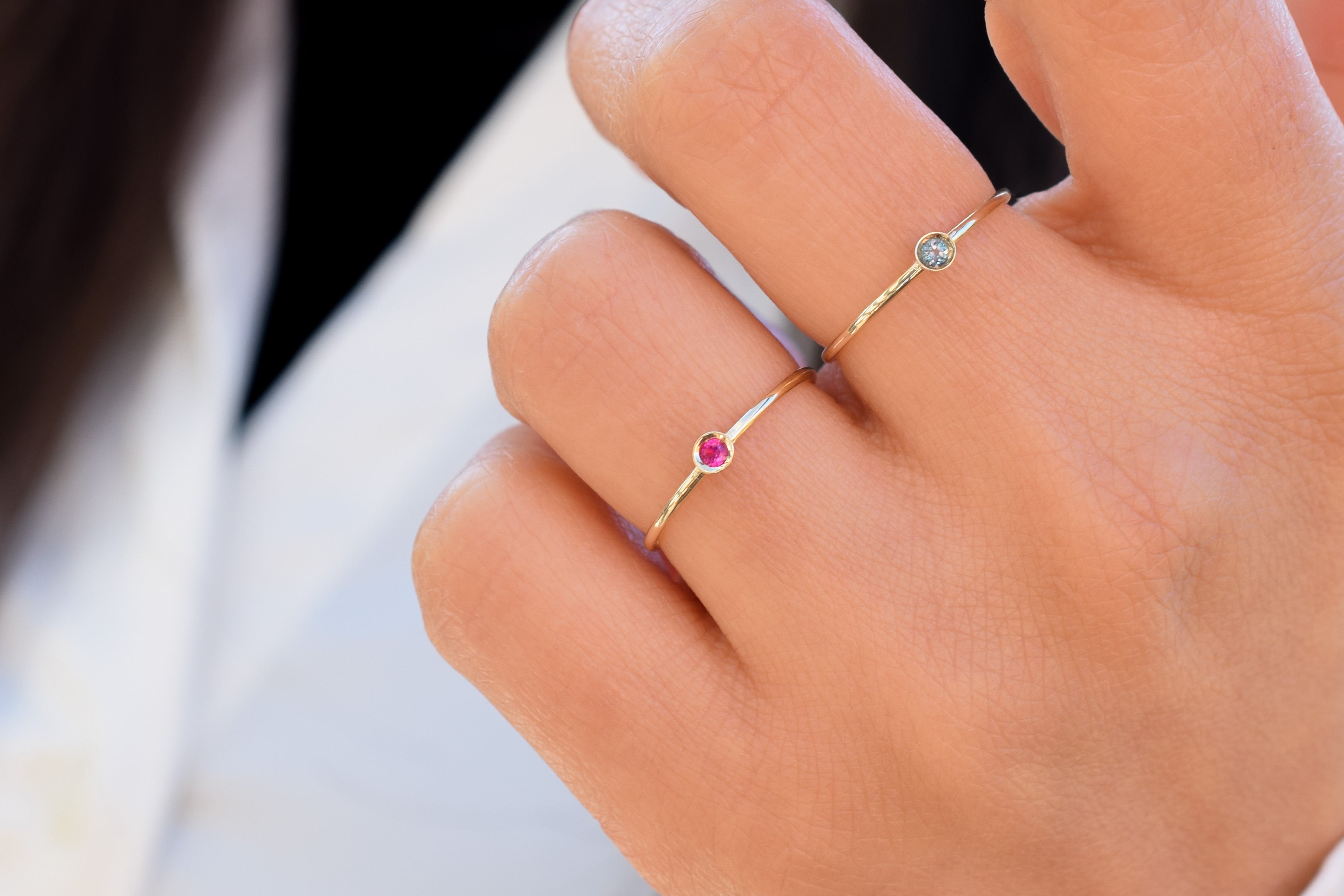 De ring is gemaakt met een kastzetting die je steen veilig houdt en hem een ​​strakke en eenvoudige uitstraling geeft. Ideaal om te stapelen met andere ringen. Houd er rekening mee dat elke ring handgemaakt is, dus er kan een verschil zijn tussen elke ring met de maat en vorm van de ring en ook een klein verschil in steenkleur. We gebruiken natuurlijke en in het laboratorium gemaakte stenen, zie de onderstaande lijst voor meer informatie.