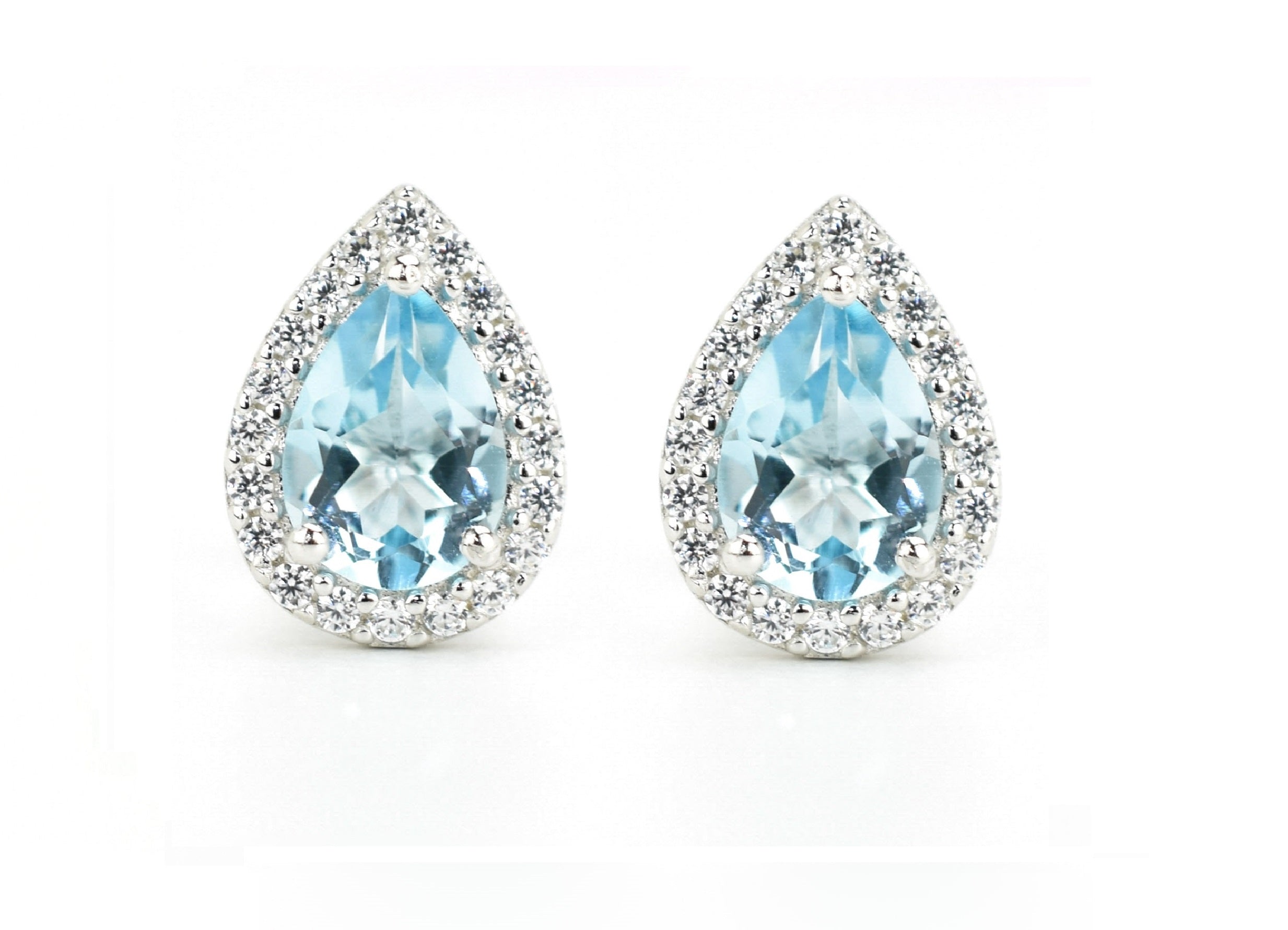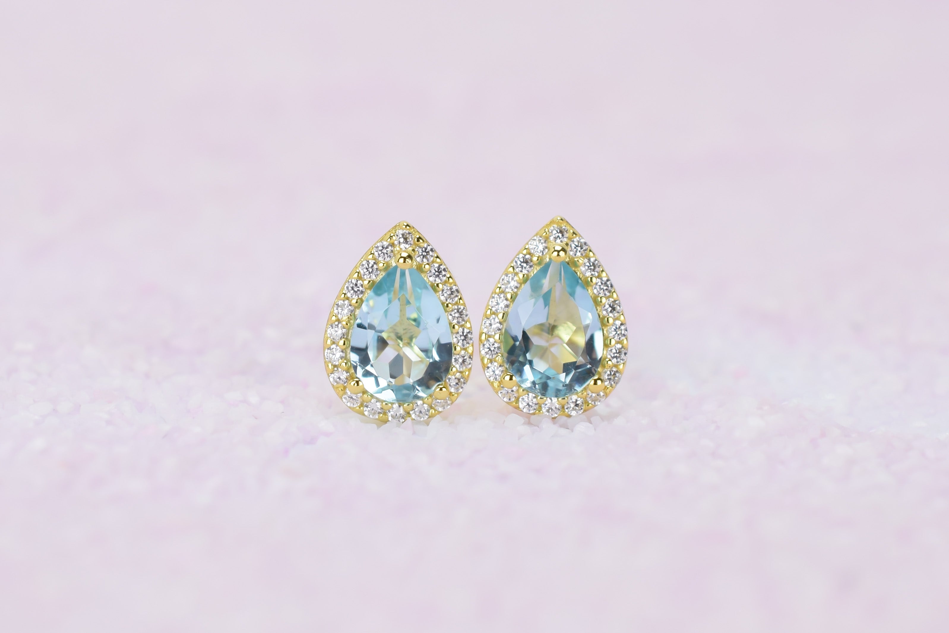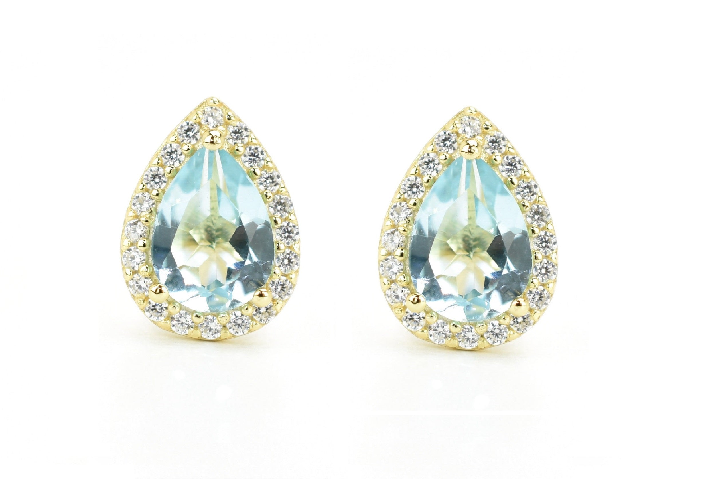 Deze aantrekkelijke oorsieraden in de vorm van een druppel zijn bezet met natuurlijke licht blauwe topaas edelstenen en kleine imitatiediamanten.