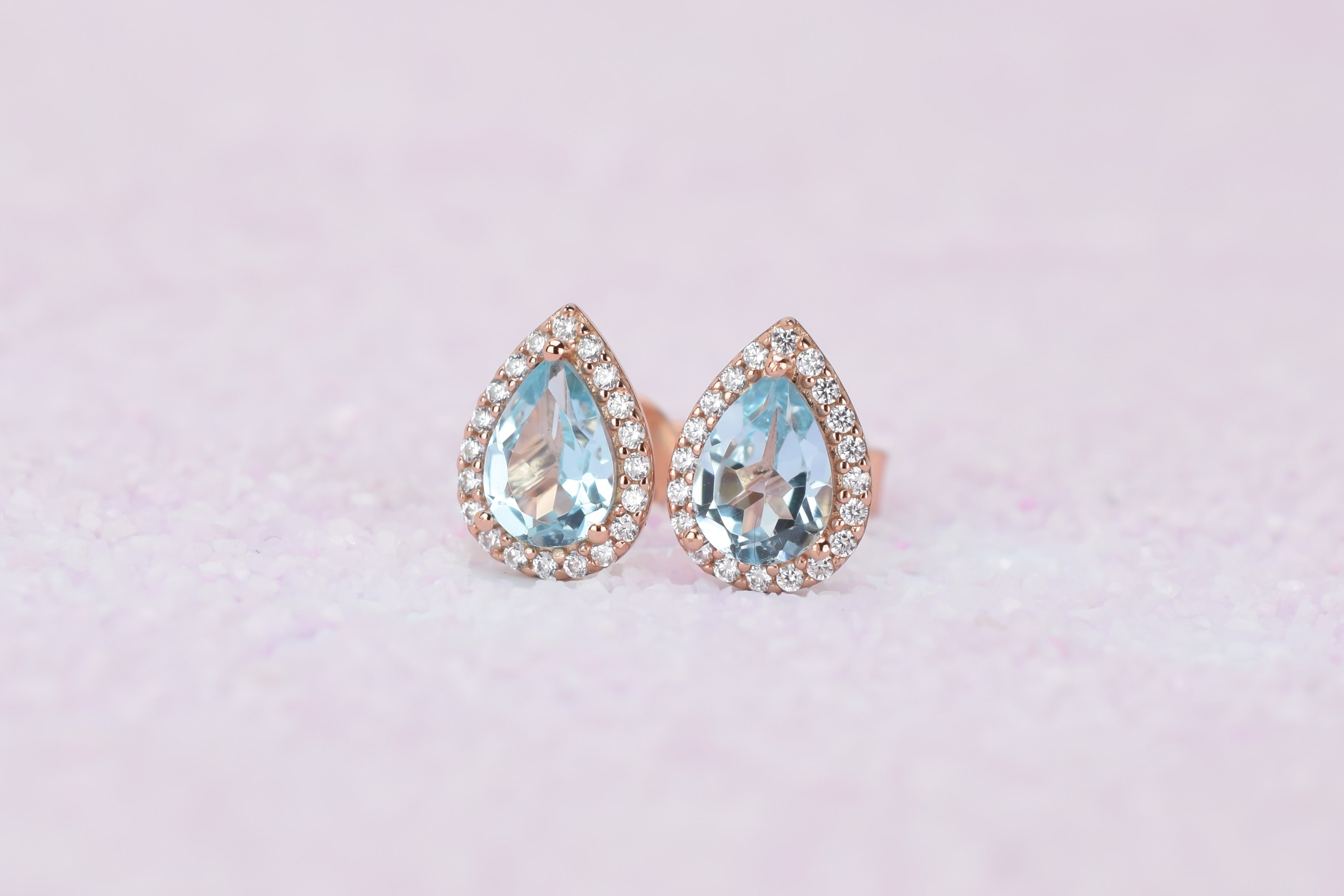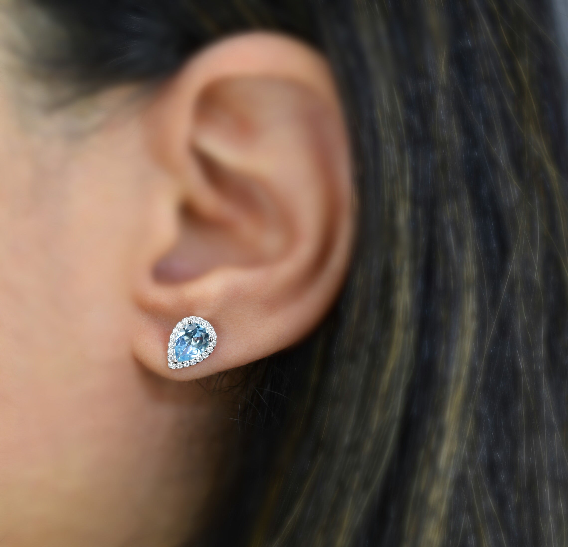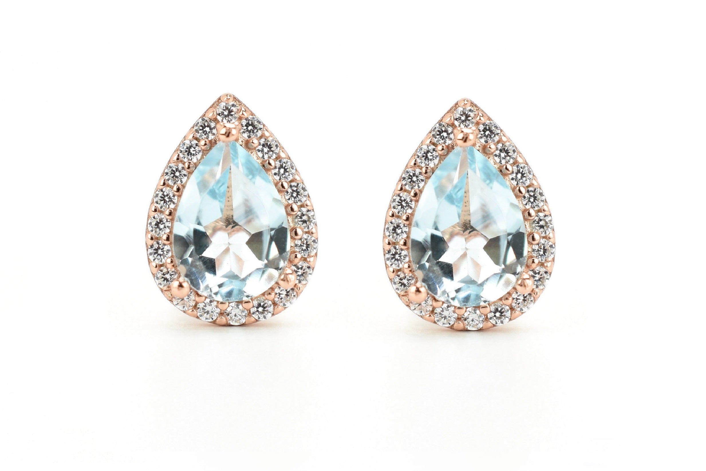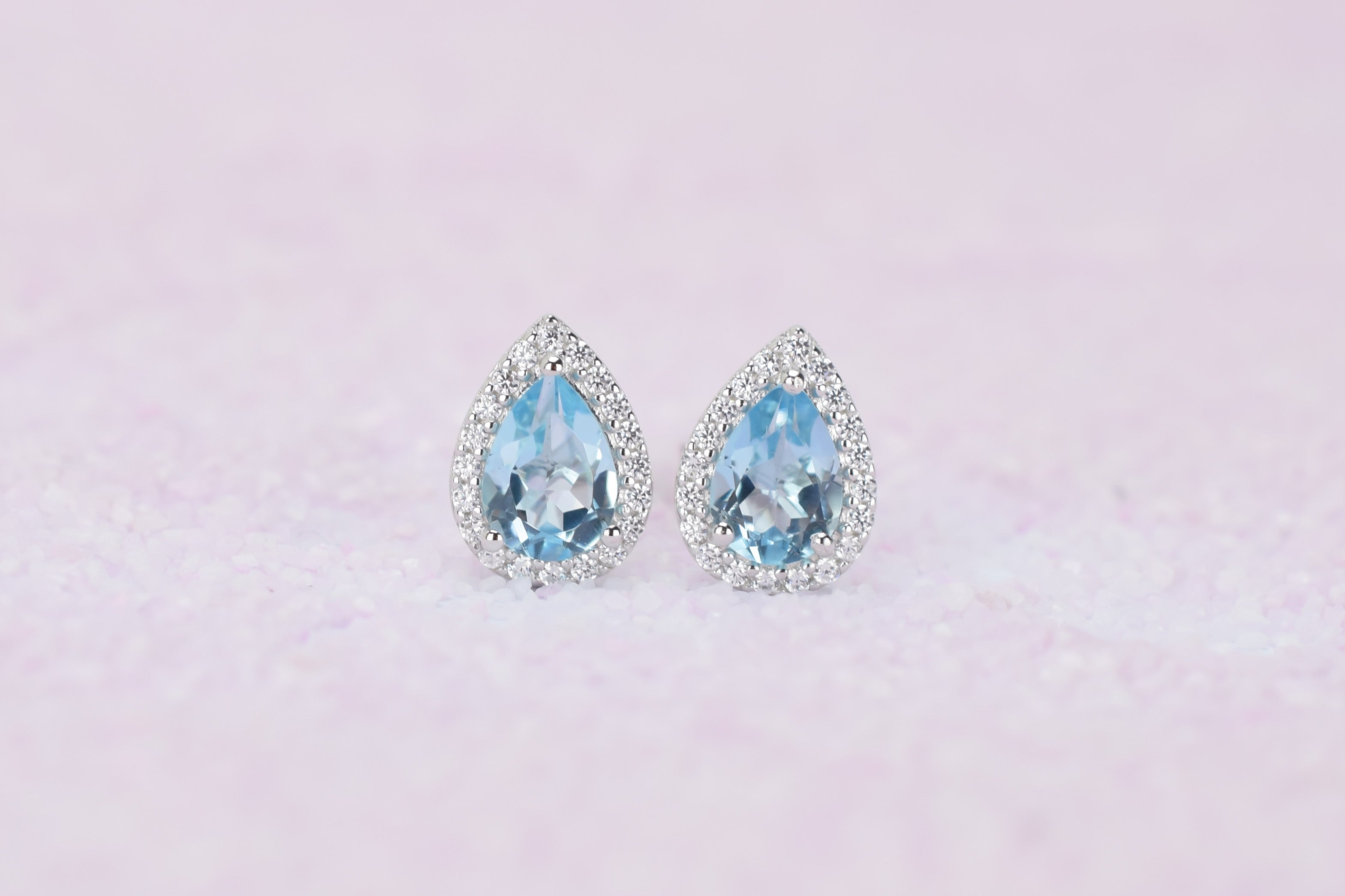 Deze aantrekkelijke oorsieraden in de vorm van een druppel zijn bezet met natuurlijke licht blauwe topaas edelstenen en kleine imitatiediamanten.