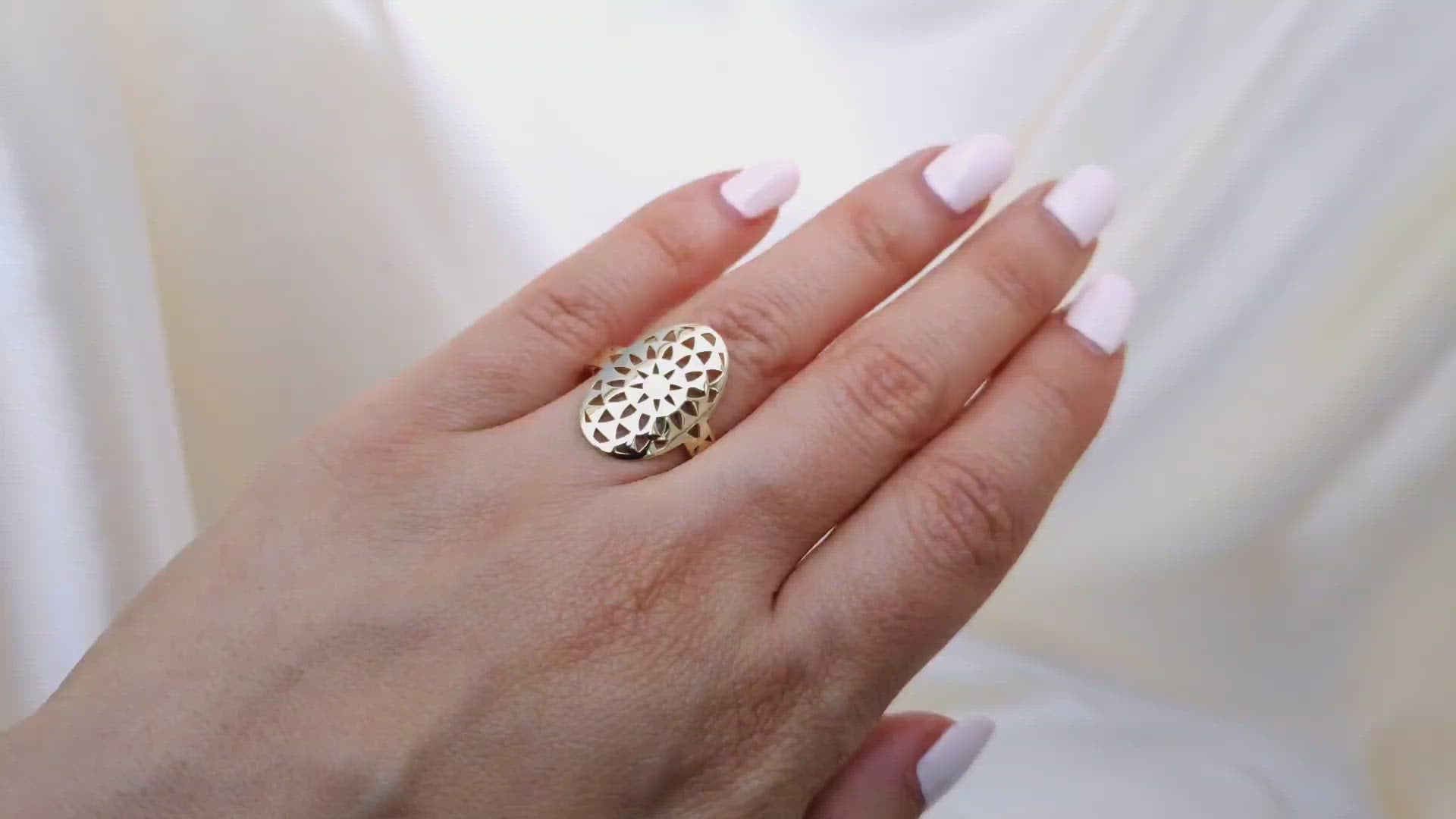 14k gouden brede ring met fijne opengewerkte vormpjes. Je zult versteld staan ​​hoe licht dit stuk is voor zijn formaat. Door een nieuwe techniek te gebruiken hebben we de perfecte statement ring voor speciale gelegenheden gecreëerd. De ring is vervaardig van geheel 14 karaat goud en gepolijst voor een blijvende glans.