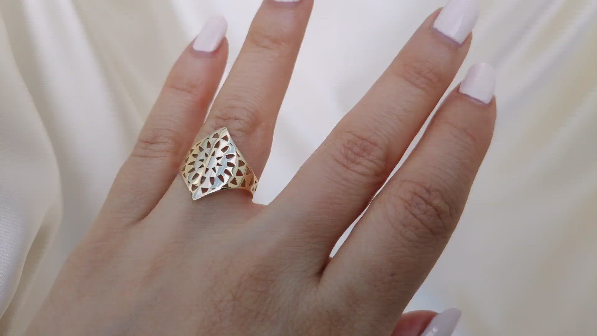 14k gouden brede ring met fijne opengewerkte vormpjes. Je zult versteld staan ​​hoe licht dit stuk is voor zijn formaat. Door een nieuwe techniek te gebruiken hebben we de perfecte statement ring voor speciale gelegenheden gecreëerd. De ring is vervaardig van geheel 14 karaat goud en gepolijst voor een blijvende glans.