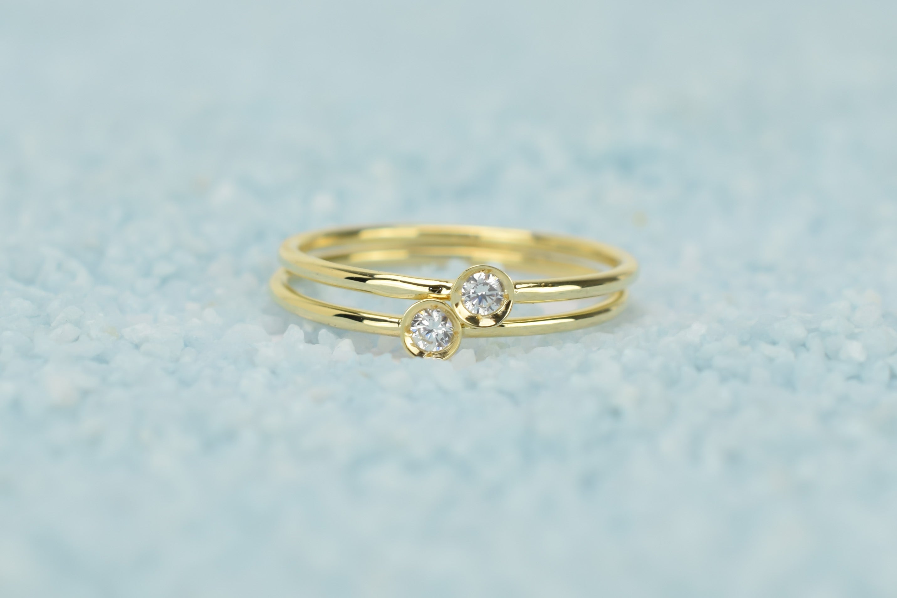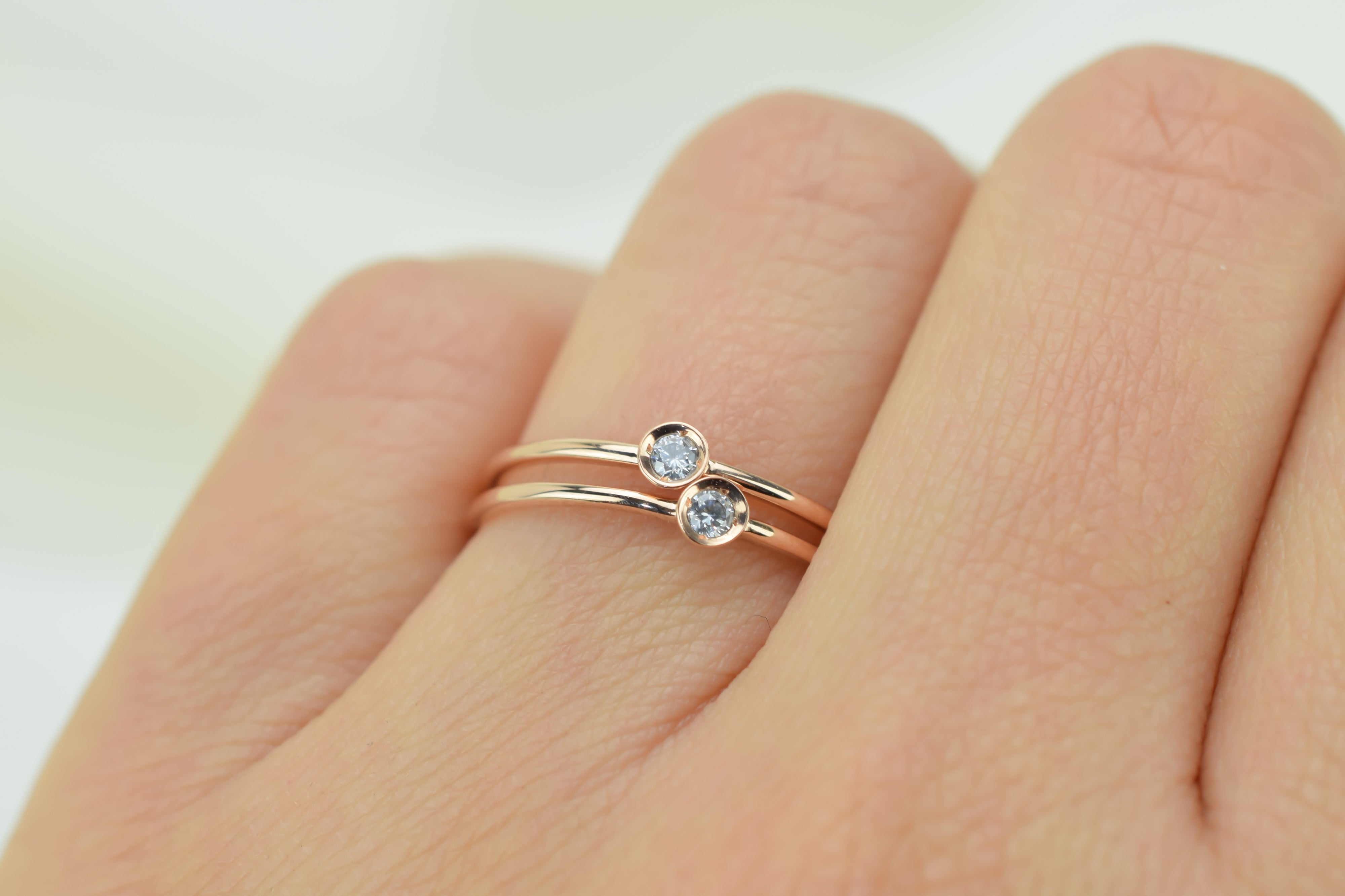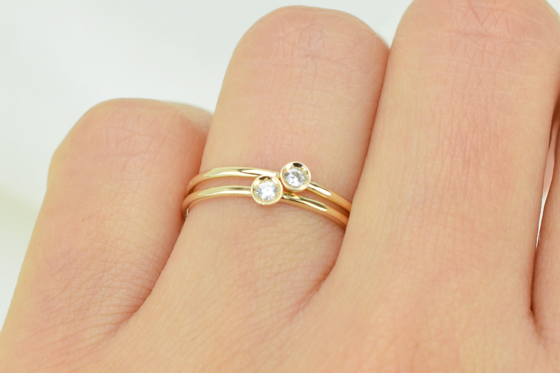 Straal met deze 14k gouden petite solitaire ring set. De twee ringen zijn gemaakt met een kastzetting die je steen veilig houdt en hem een strakke en eenvoudige uitstraling geeft. Ideaal om te stapelen met andere ringen.