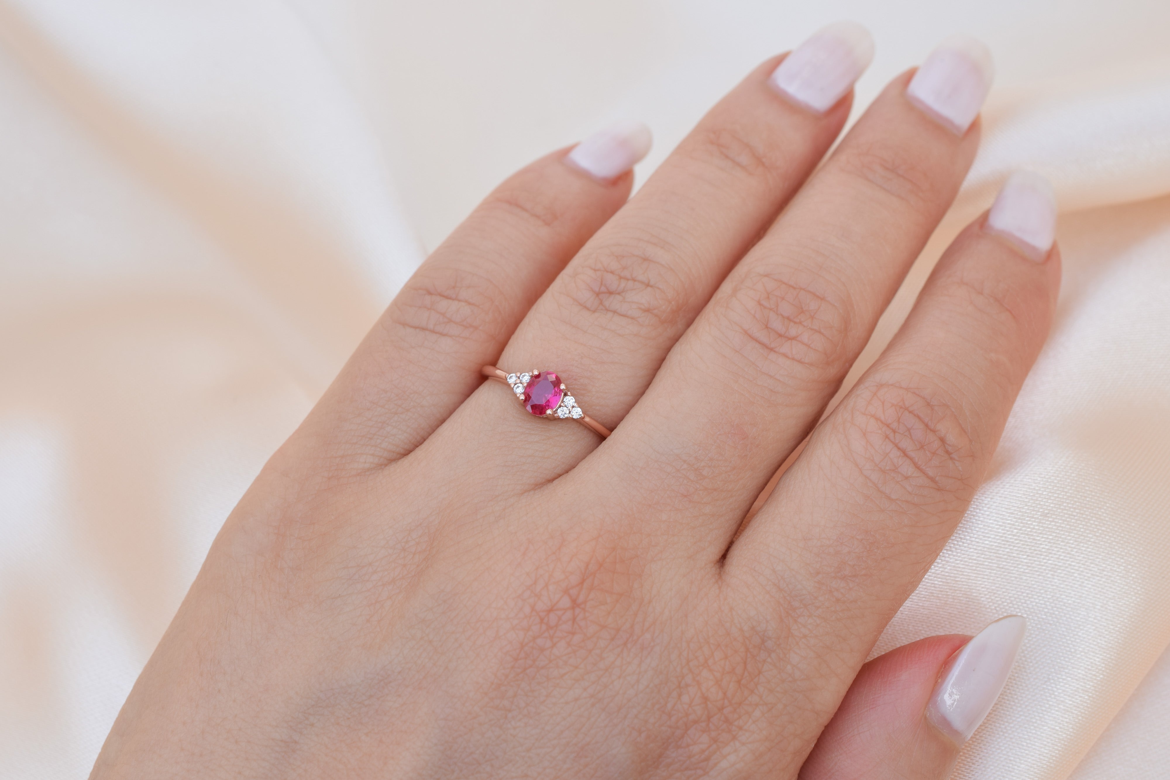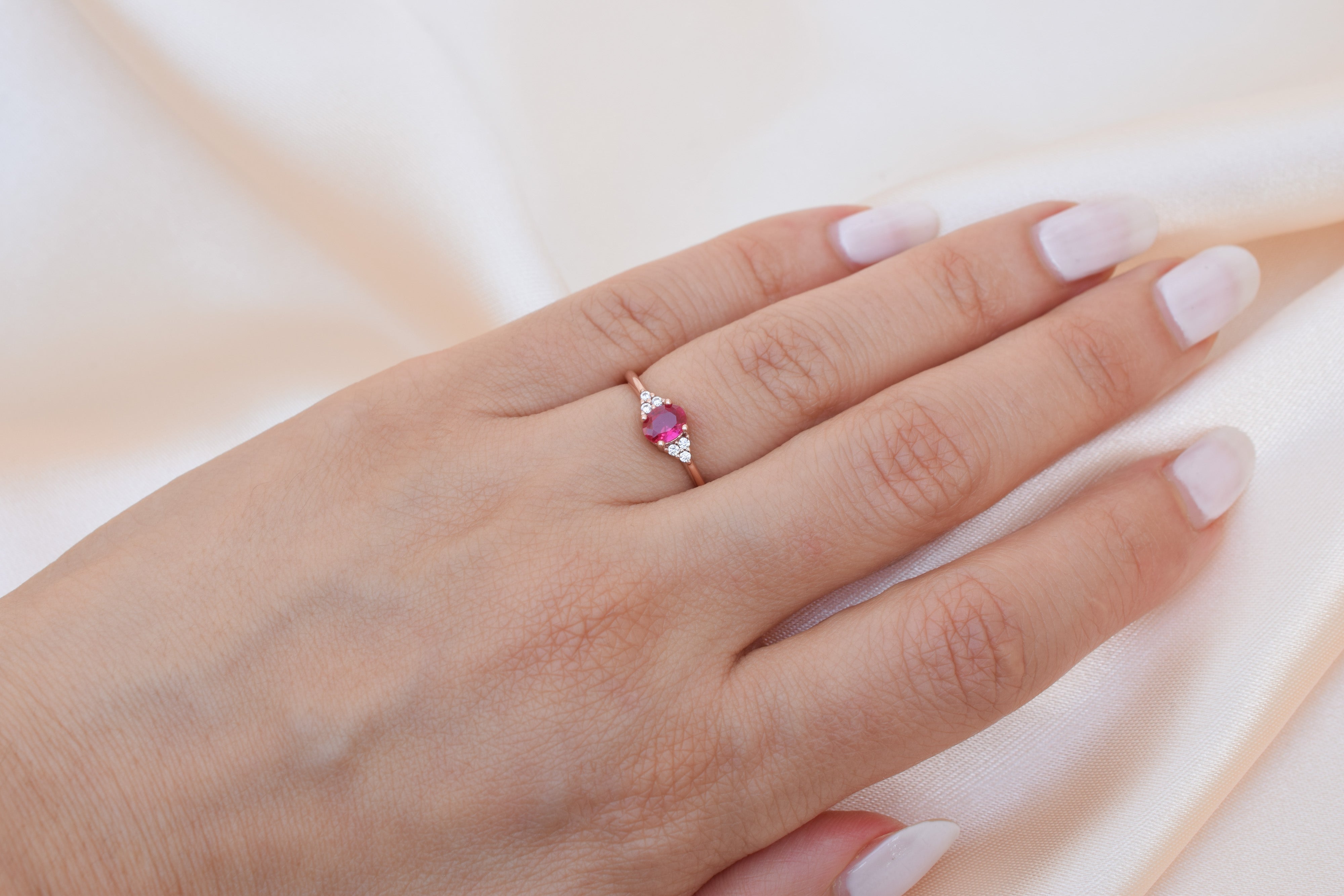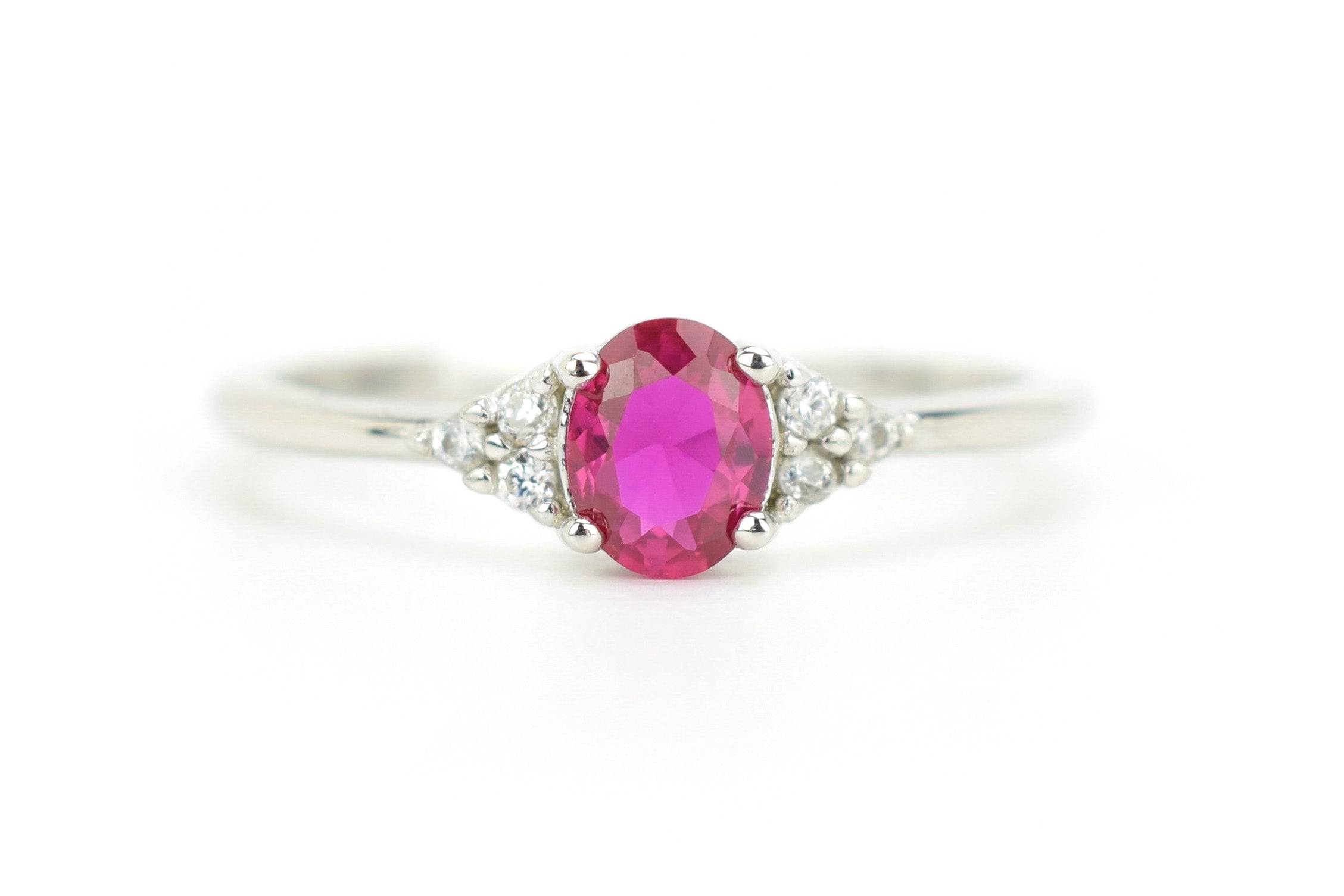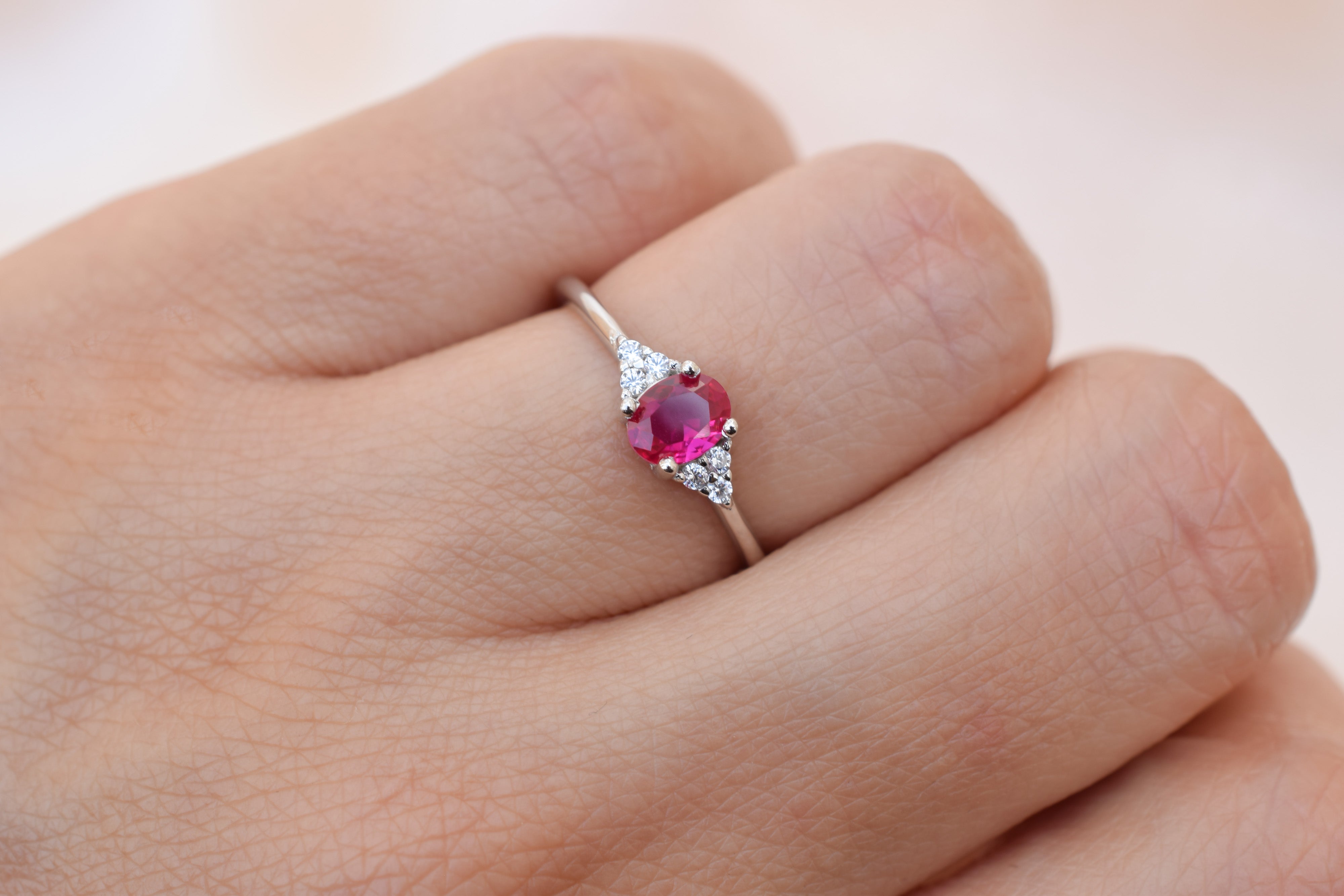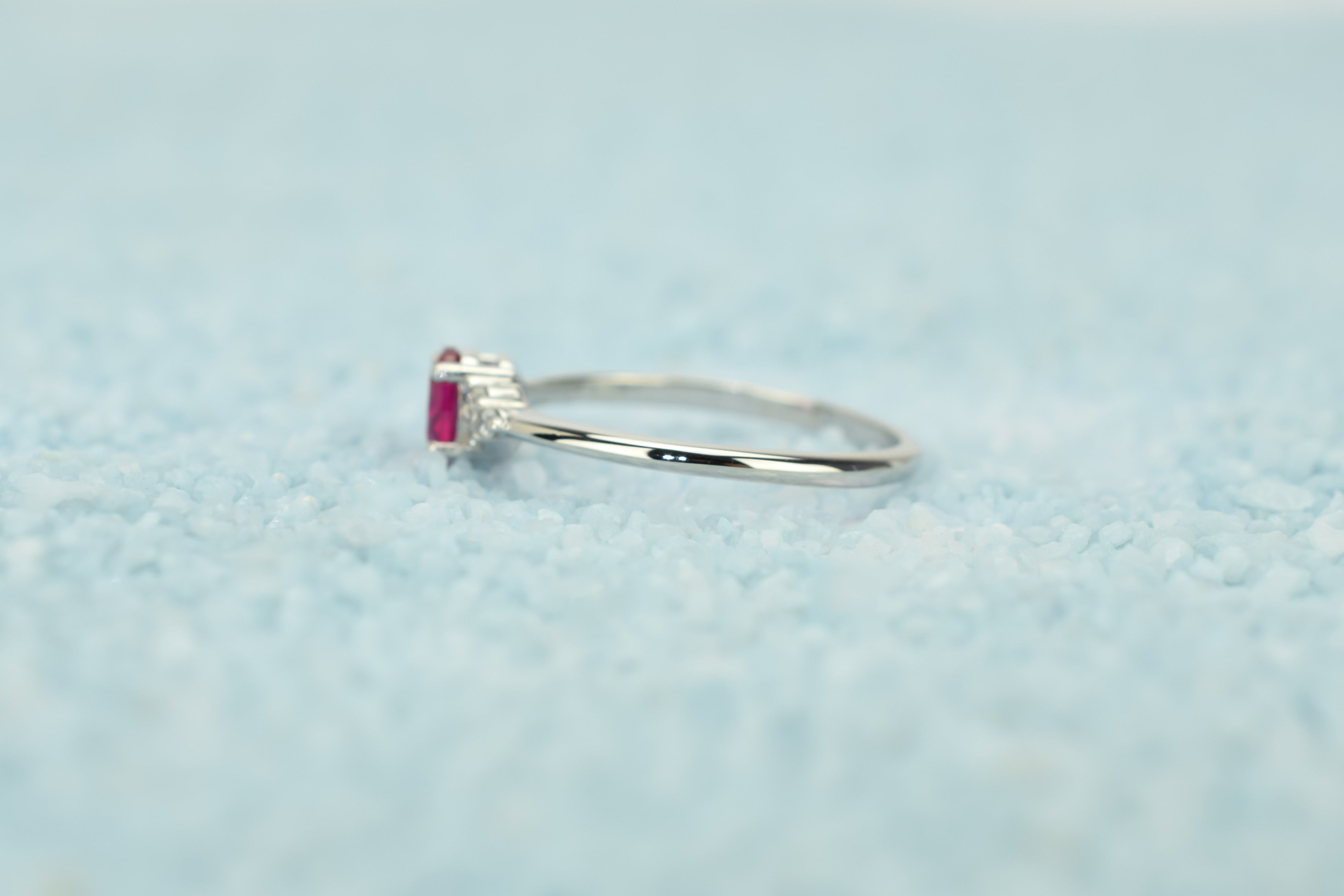 Deze handgemaakte ring, gesmeed naar een eigen ontwerp, is met kristalheldere precisie en zorg vervaardigd om de hoogste kwaliteit te garanderen. De middelste steen is een lab created Robijn, en de kleine accentstenen zijn imitatiediamanten die zorgvuldig zijn geselecteerd vanwege hun hoge kwaliteit.