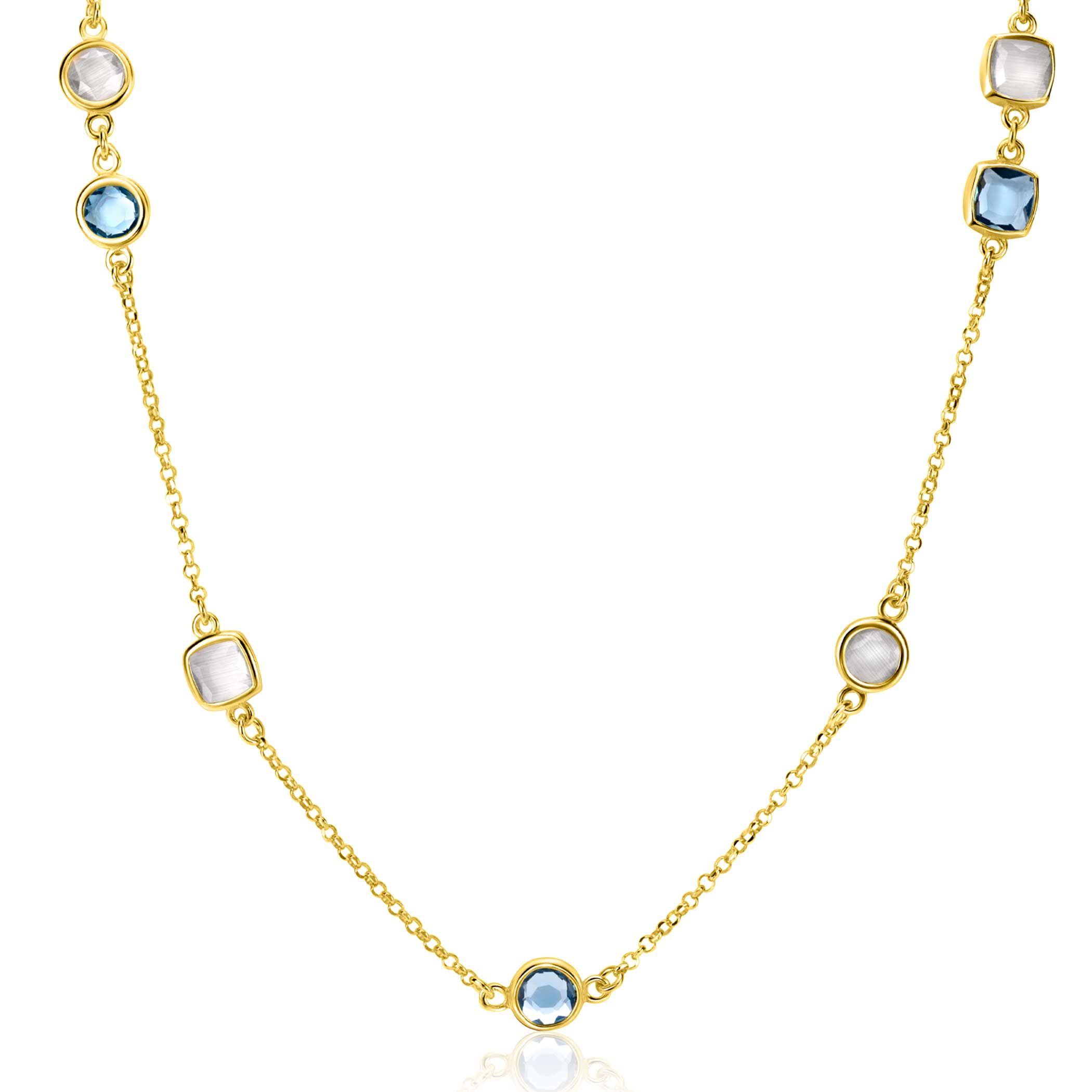 ZINZI gold plated zilveren ketting met ronde en vierkante zettingen jeansblauw en witgrijs 42-45cm ZIC2526G