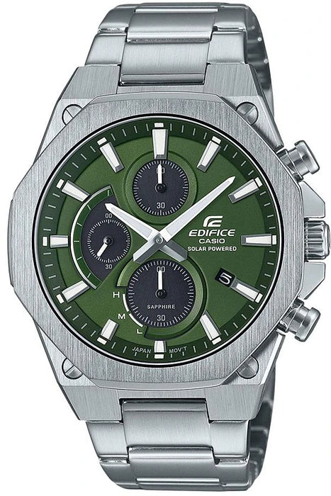 Die CASIO EDIFICE EFS-S570D-3AUEF hat ein rundes Gehäuse mit silberner Oberfläche. Es besteht aus Edelstahl, was für Langlebigkeit und ein luxuriöses Aussehen sorgt. Die Uhr verfügt über ein grünes Zifferblatt und ein Saphirglas, das hervorragenden Schutz vor Kratzern und Beschädigungen bietet.
