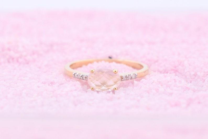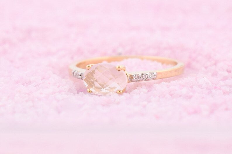 14k goud ovaalvormige ring met een natuurlijke rose kwarts steen, de steen is horizontaal gezet om je een unieke ring te geven. De ring heeft aan beide zijde een rij van natuurlijke diamanten.
