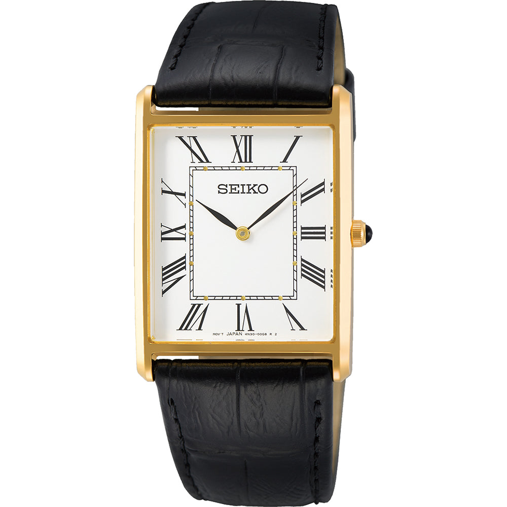Diese Seiko-Uhr hat ein 28-mm-Edelstahlgehäuse und ein Lederarmband. Im Inneren des Gehäuses befindet sich ein hochwertiges Seiko-Uhrwerk und ist mit Hardlex-Kristall veredelt.