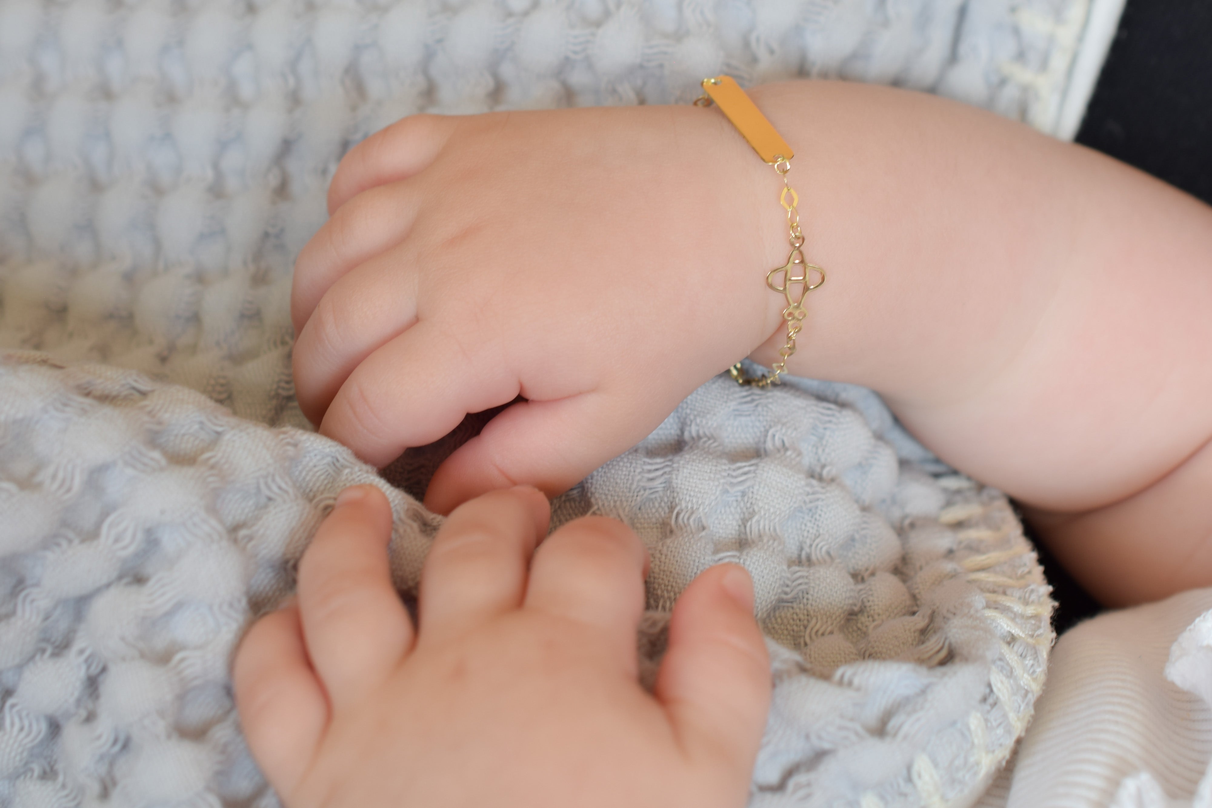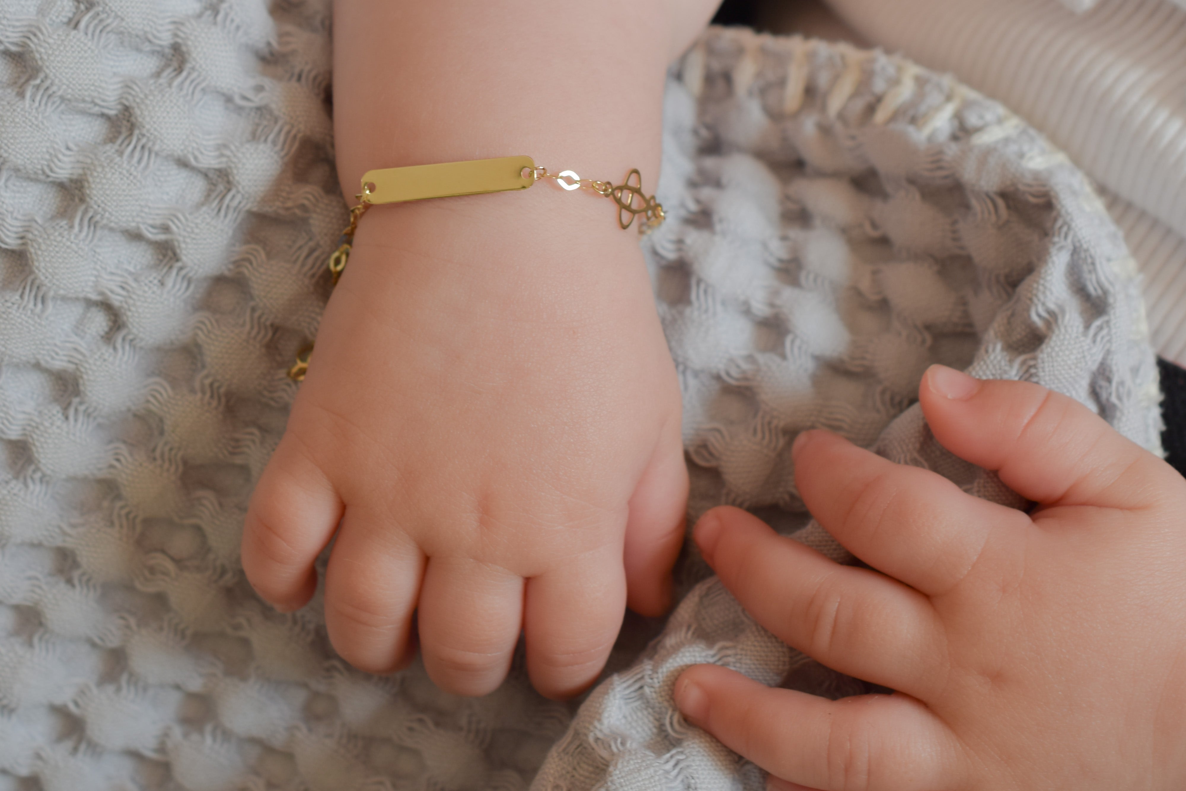 The BeMy Baby gold 14 carat collection are bracelets specially made for newborn babies and children with an engraving plate. Thanks to the special links of the chain, the bracelet can be adjusted to the size of the wrist.