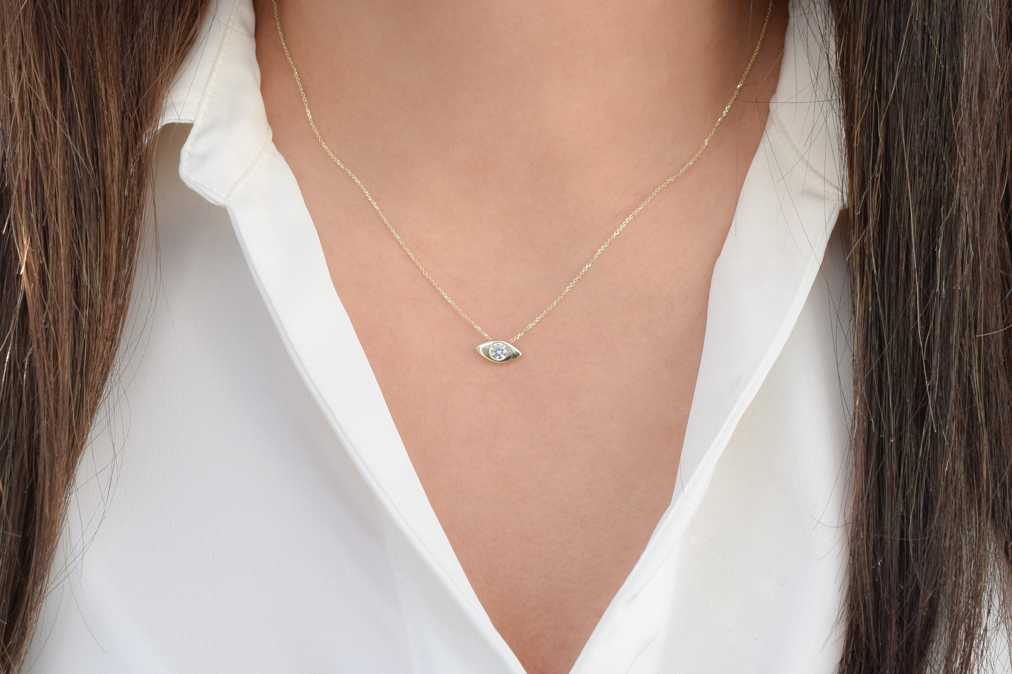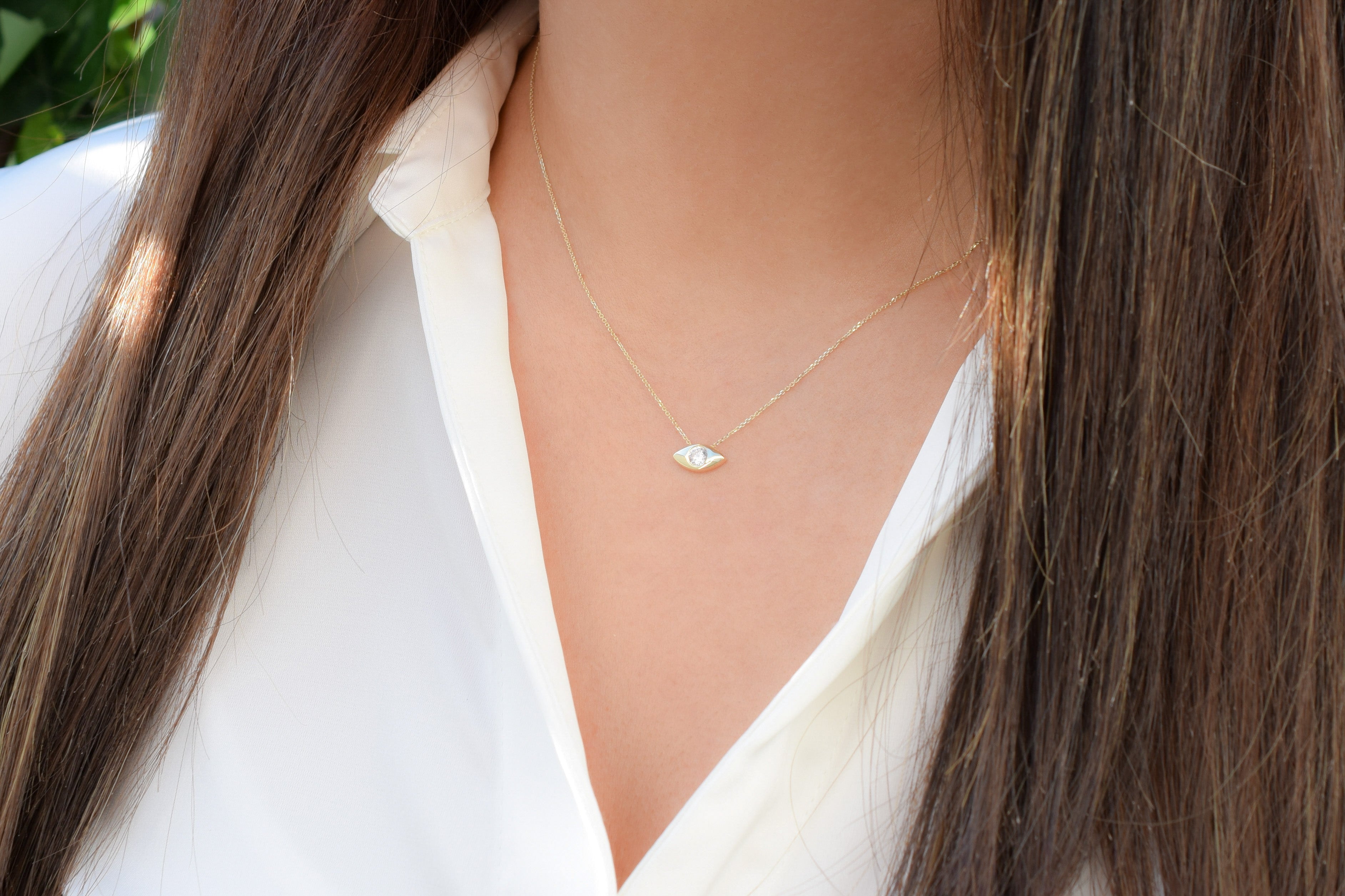 This stylish necklace in the shape of an eye is set with a sparkling clear stone. The necklace is adjustable in length, making it look beautiful with any outfit and easy to combine with other necklaces.
