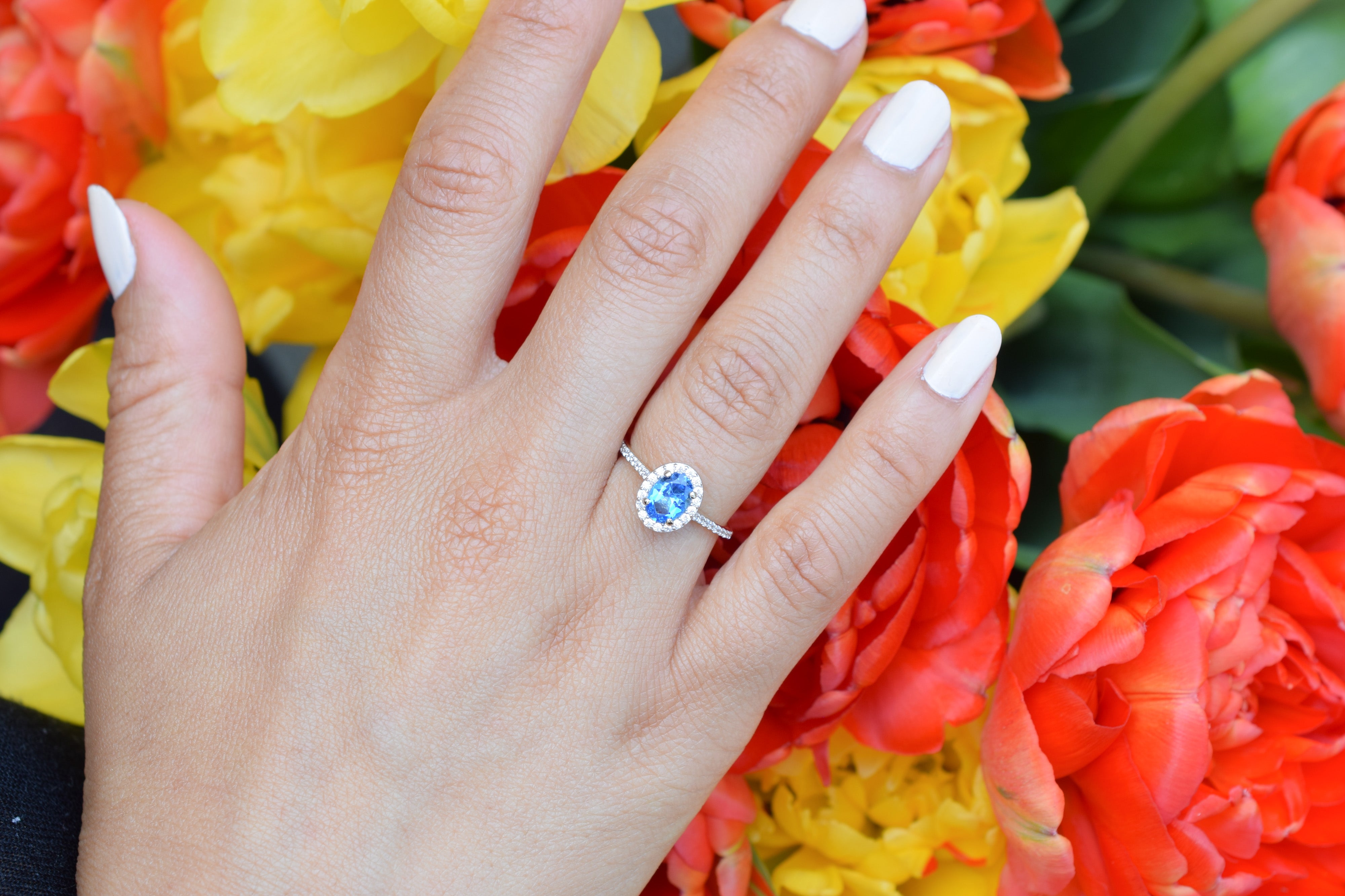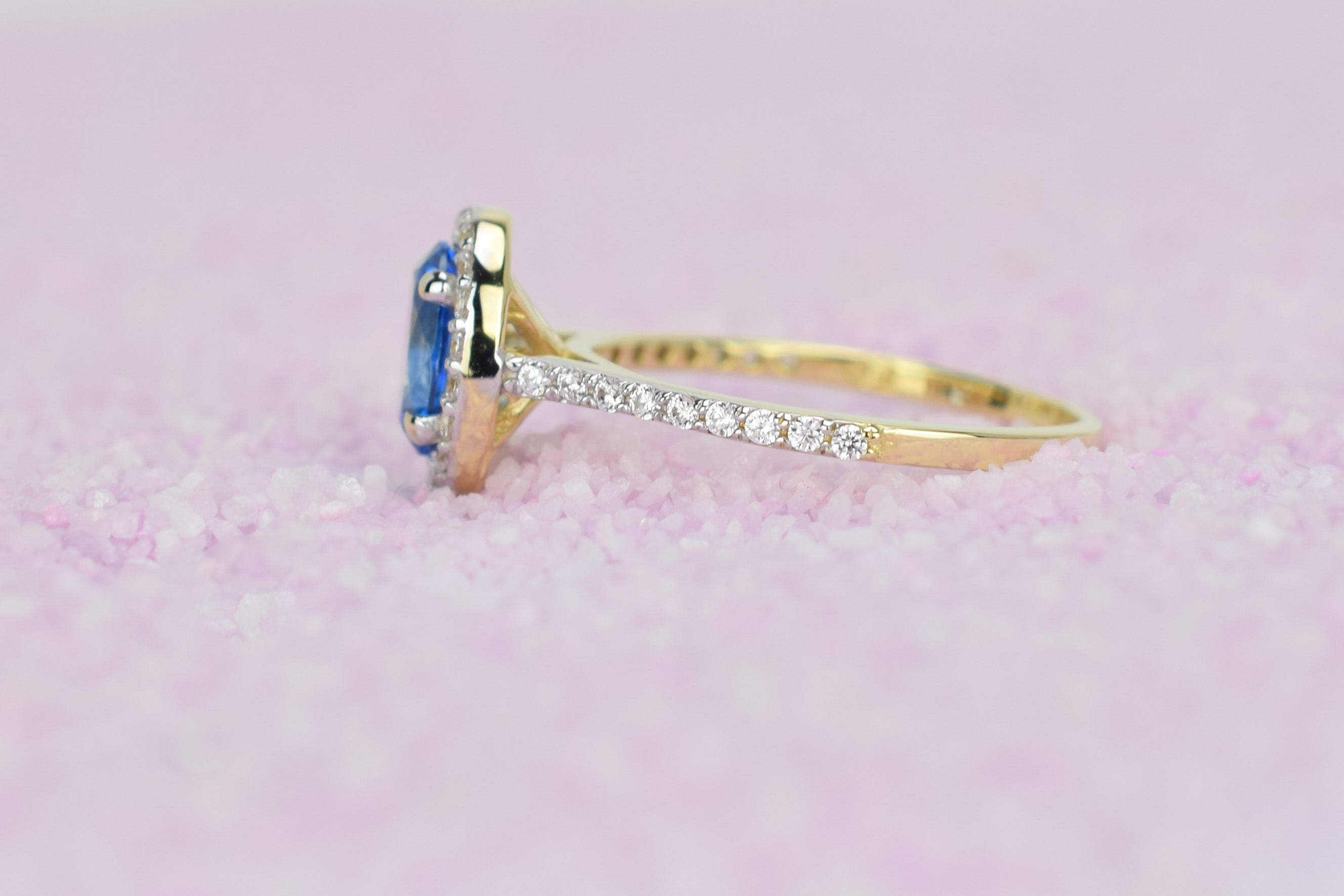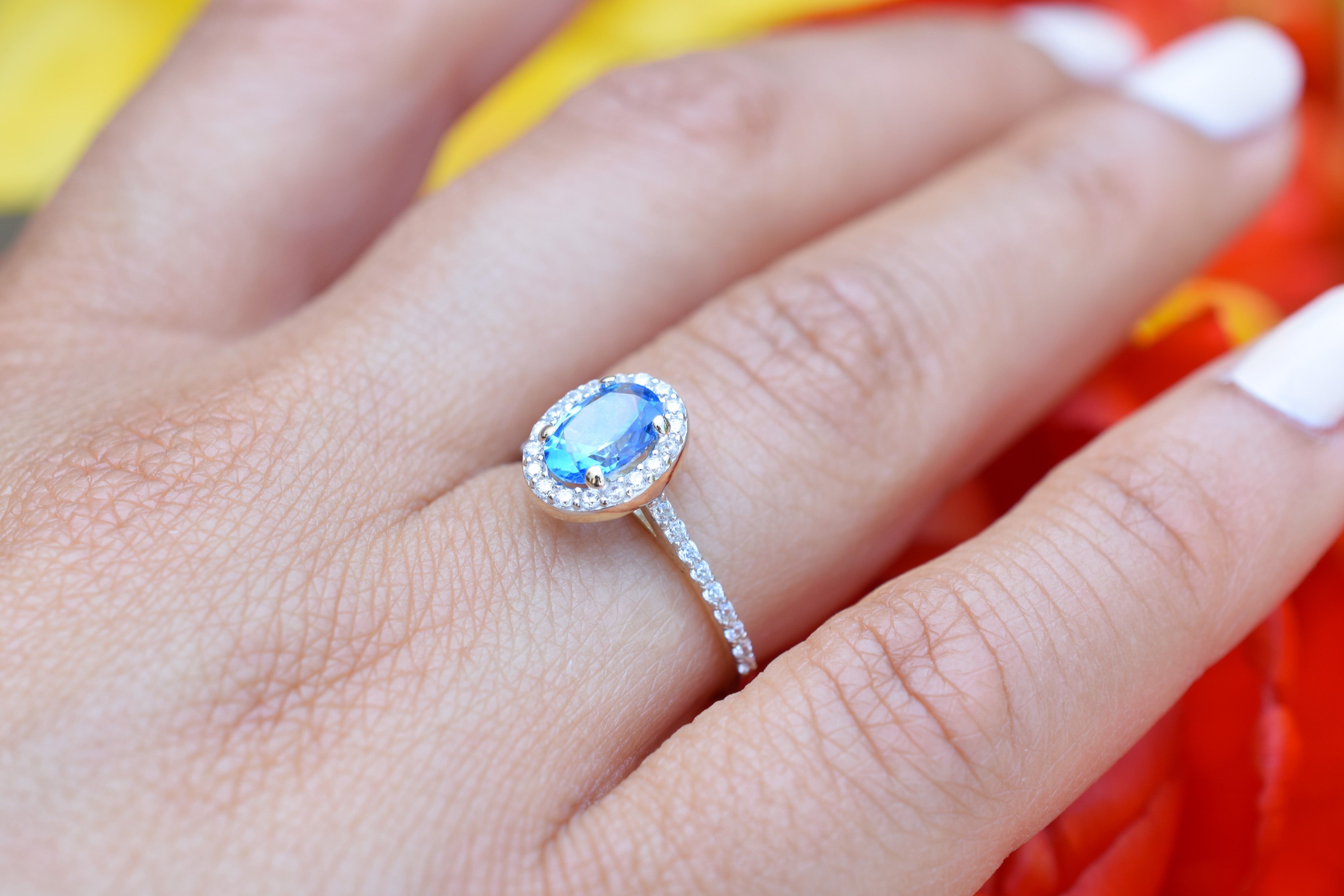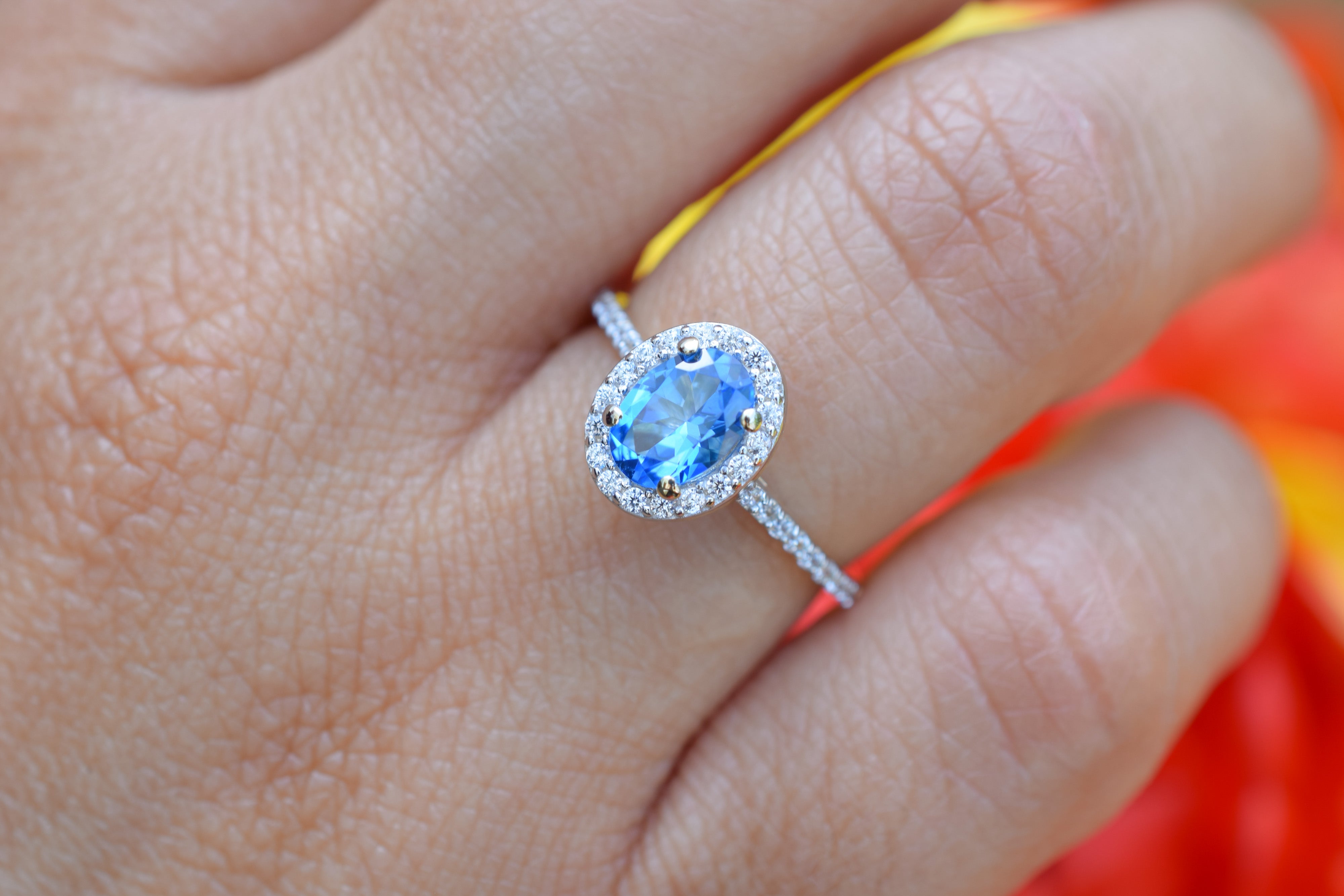 14k gold halo oval-shaped halo ring with a natural blue topaz stone, an enchanting design that you won't be able to take your eyes off.