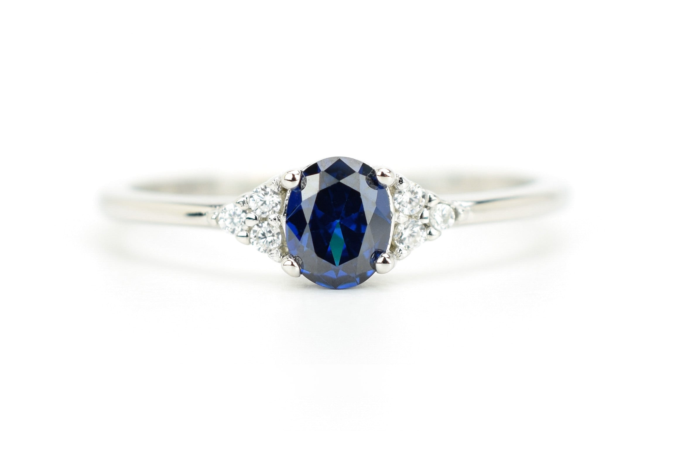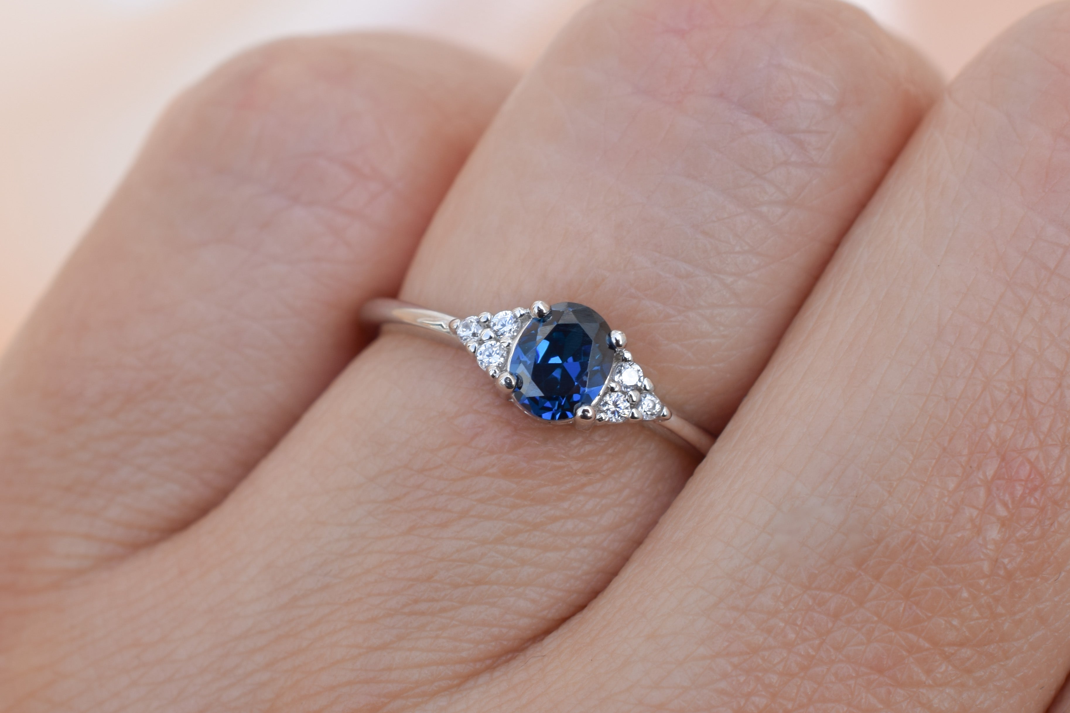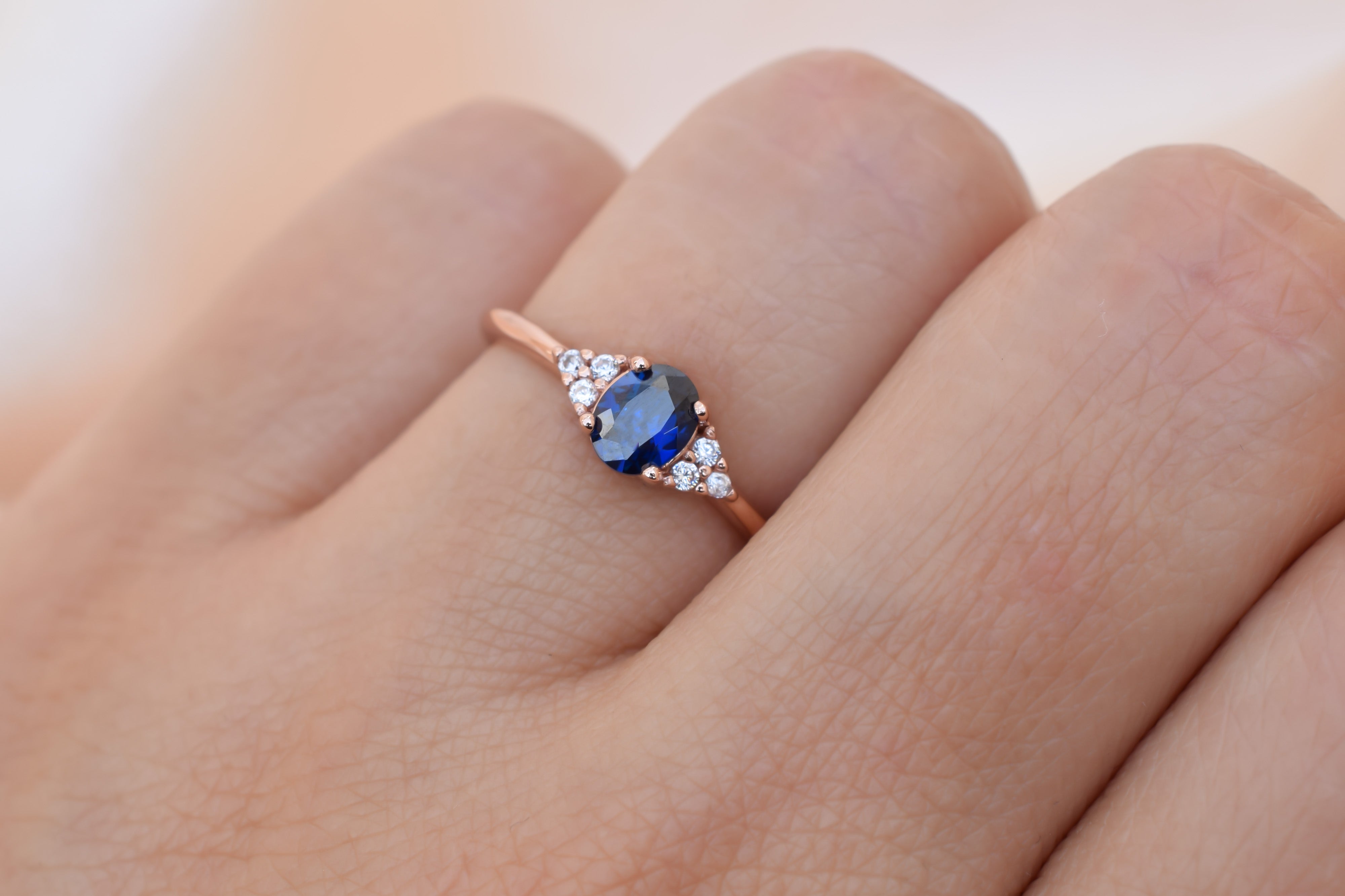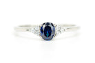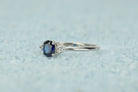 This oval ring, adorned with three small side stones on each side, is a stunning beauty. The center stone features a beautiful dark blue sapphire that creates a truly enchanting effect.