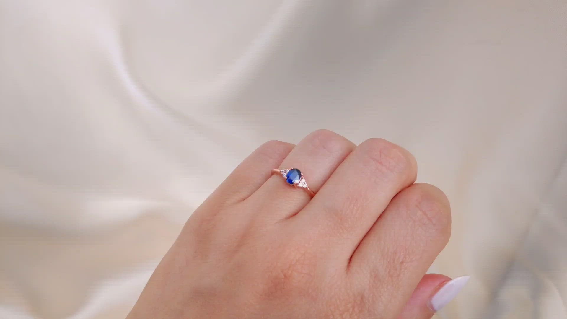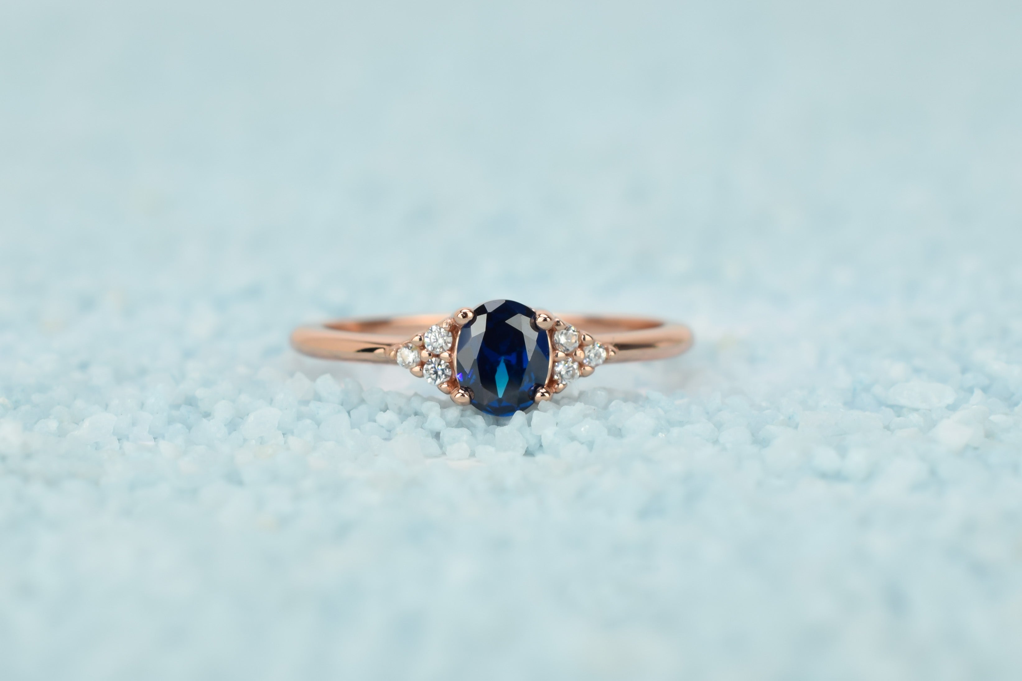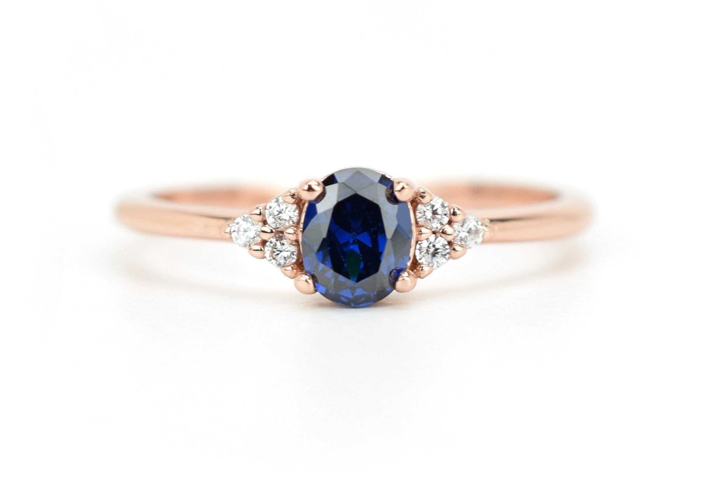 This oval ring, adorned with three small side stones on each side, is a stunning beauty. The center stone features a beautiful dark blue sapphire that creates a truly enchanting effect.