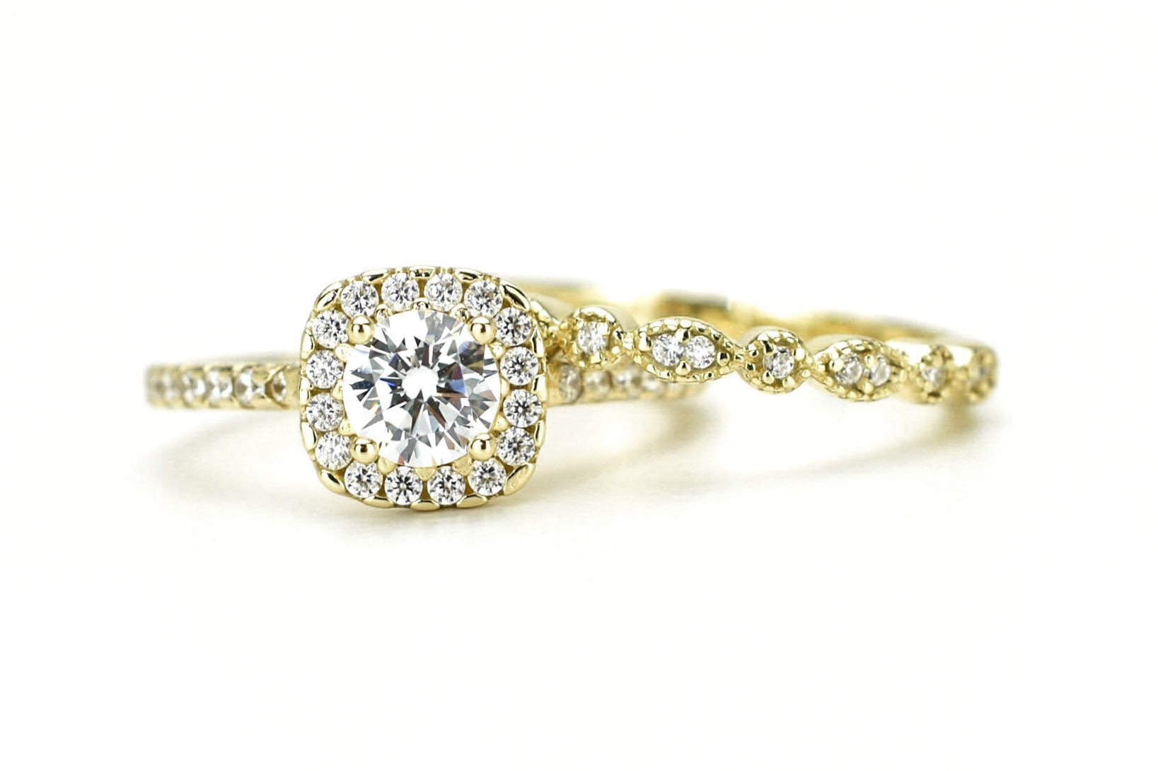 This handcrafted ring set, forged to a unique design, is crafted with crystal-clear precision and care to ensure the highest quality. The center stone and small accent stones are imitation diamonds, carefully selected for their high quality.