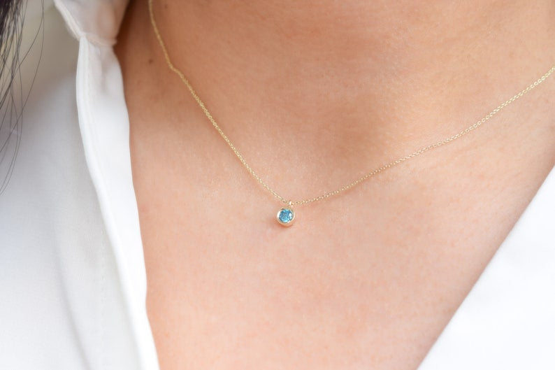 Ontdek de verfijnde charme van onze gouden ketting met een ronde aquamarijn steen van 3 mm. Deze delicate ketting, vervaardigd uit hoogwaardig 14-karaats goud, straalt eenvoud en elegantie uit. Het fijne goudschakelwerk is ontworpen om comfortabel te dragen en geeft een subtiele glans die elke outfit verfraait.