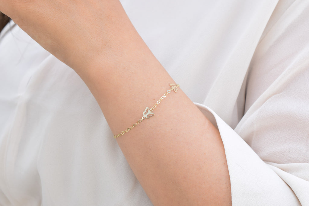Unieke de armband is gemaakt van 14k goud en voorzien van twee vlinder bedels, wat de armband een vrolijke en luchtige uitstraling geeft. De vlinder bedels staan symbool voor verandering en vrijheid, en geven de armband een uniek karakter. De armband is verstelbaar en past daarom comfortabel om elke pols.