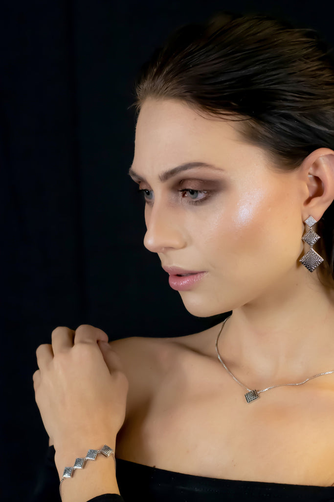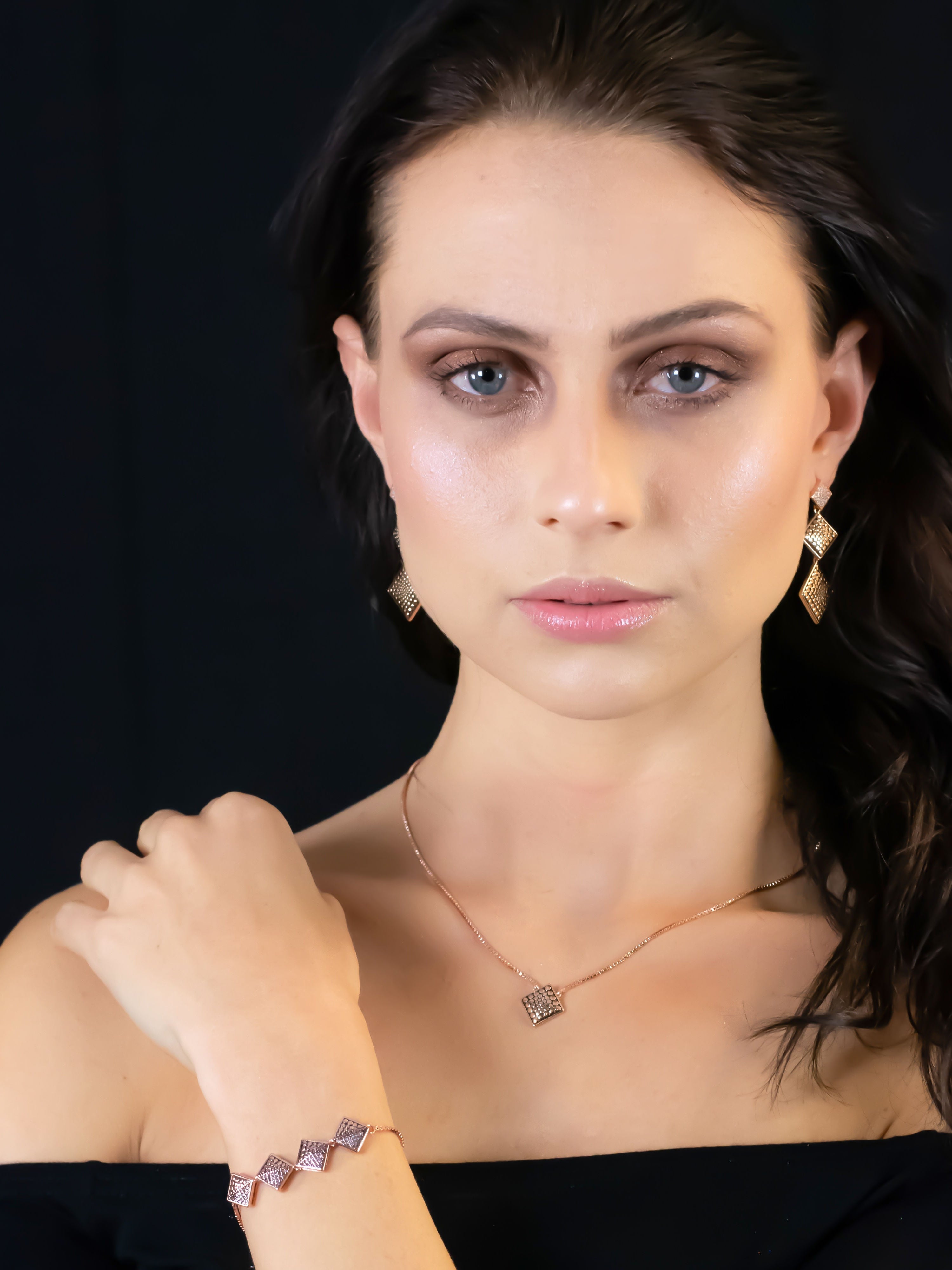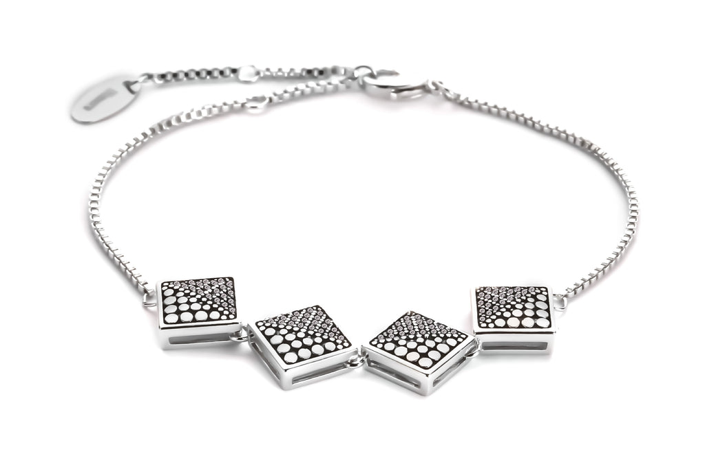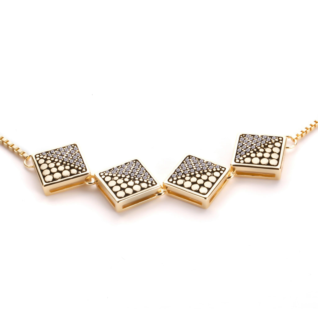 Het gepolijste sieraad bestaat uit vier vierkante schakels, elke schakel is bezaaid met de ene helft witte schitterende stenen en de andere helft bestaat uit gladde gouden stippen.
