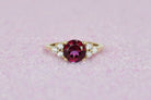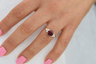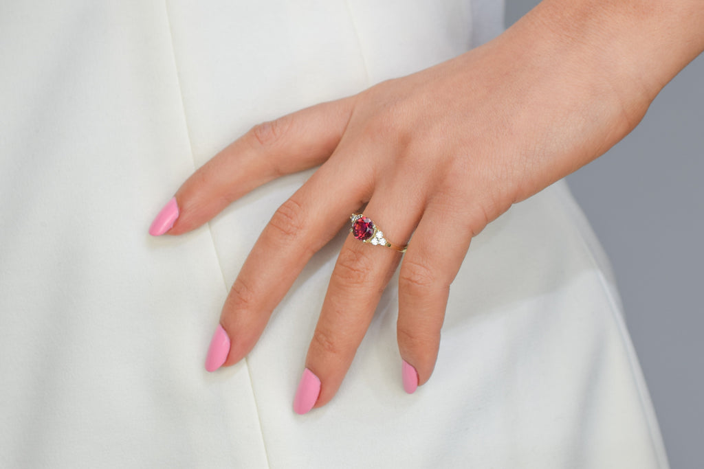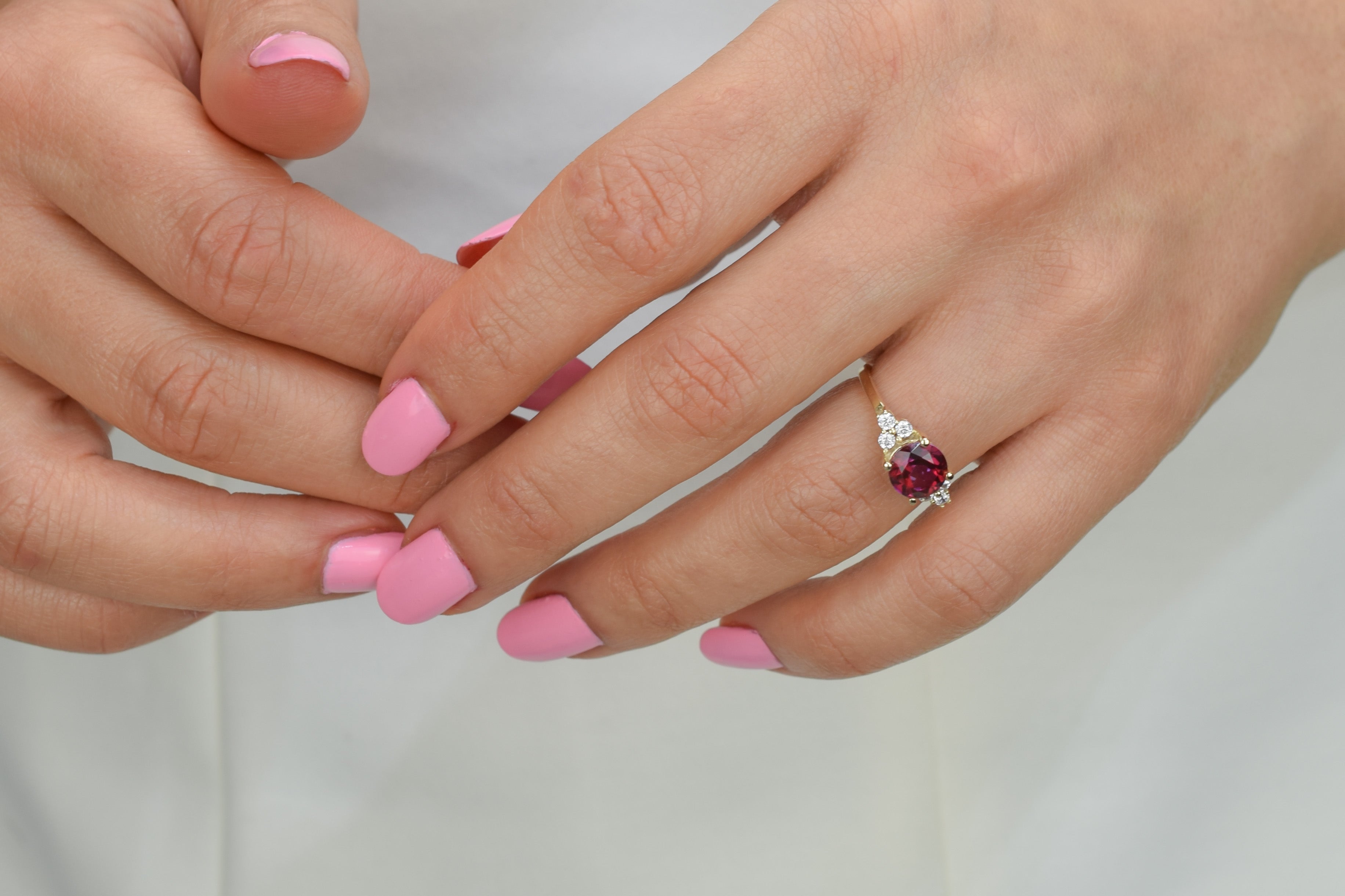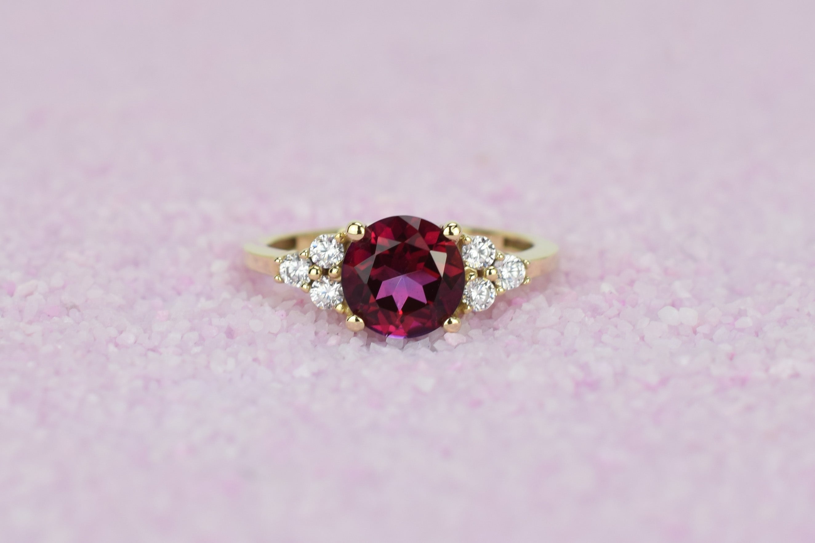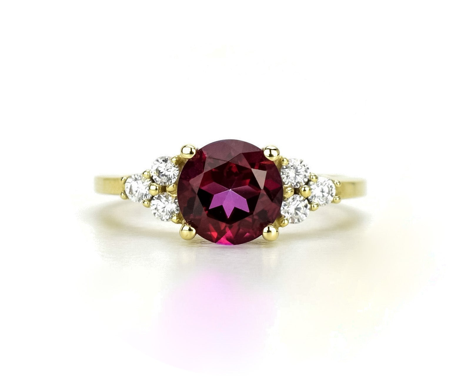 Deze stijlvolle feminien ring is vervaardigd uit 14k goud en is gezet met een natuurlijke donker rode topaas Swarovski steen.